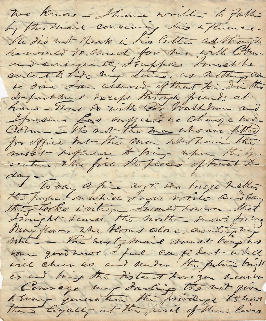 Today a fine cool sea breeze rustles the paper in which I now write and everything looks inviting. I would, however, that I might search the Northern snows for my Mayflower who blooms alone, awaiting my return. The next mail must bring us some good news, I feel confident, which will cheer us and render the future brighter and bring the distant horizon nearer. Courage, my darling, tis not given to every generation the privilege & shows them loyalty at the peril of their lives. There is a good piece in the Atlantic [Magazine] on the duties of woman in the present crises. There is a vast deal of truth in what that writer says.