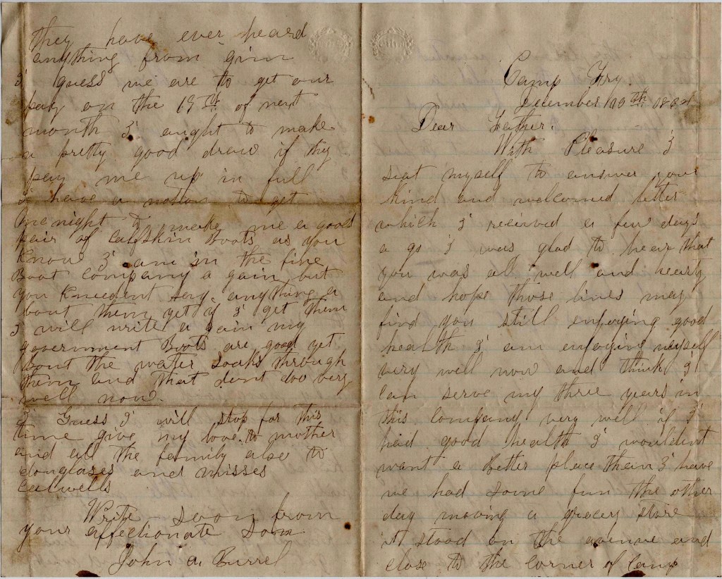 I guess we are to get our pay on the 19th of next month. I ought to make a pretty good draw if they pay me up in full. I have a notion to get me McKnight to make me a good pair of calfskin boots as you know I am in the fine boot company again, but you needn’t say anything about them yet. If I get them. I will write again. My government boots are good yet but the water soaks through them and that don’t do very well now.