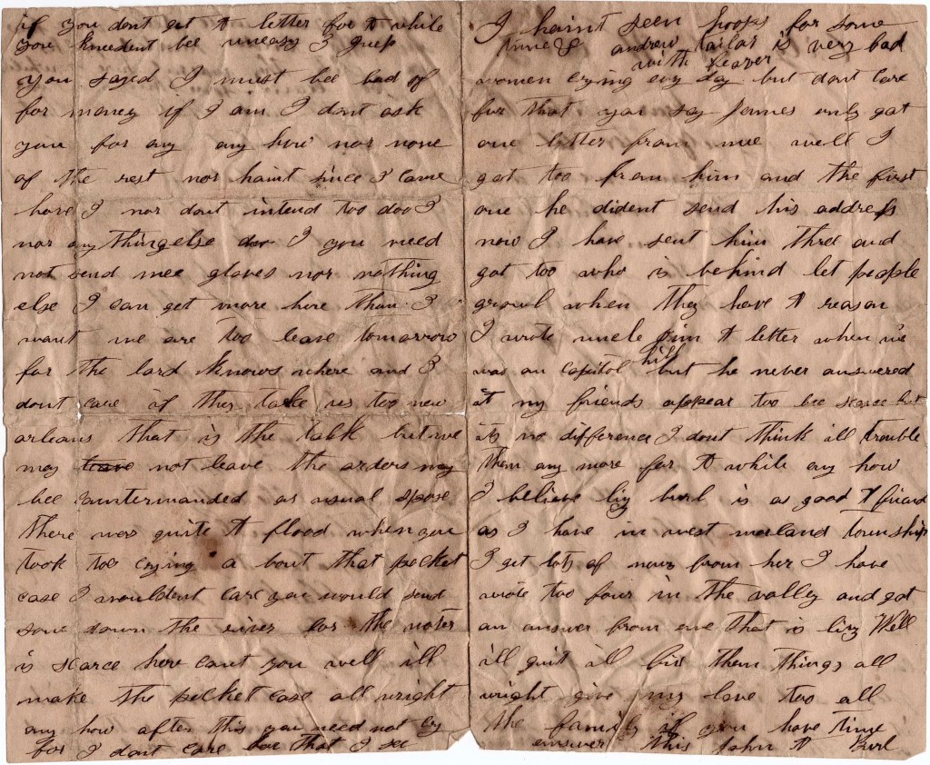 If you don’t get a letter for a while, you needn’t be uneasy, I guess. You said I must be bad off for money. If I am, I don’t ask you for any anyhow nor none of the rest not haint since I came, have I? Not don’t intend to do, nor anything else. I can get more here than I want.