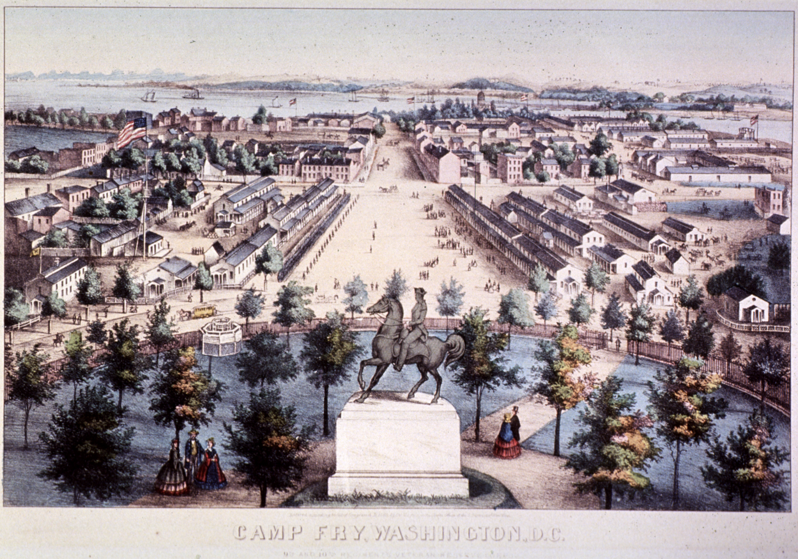 Camp Fry was the home of the 9th & 10th Veteran Reserve Corps in WDC. The view is from Washington Circle south along 23rd Street, with the equestrian statue of George Washington in the foreground and the Potomac River and the Virginia shore in the background. There appears to be a faint representation of Robert E. Lee’s house, now the site of Arlington National Cemetery, on a small hill overlooking the river.
