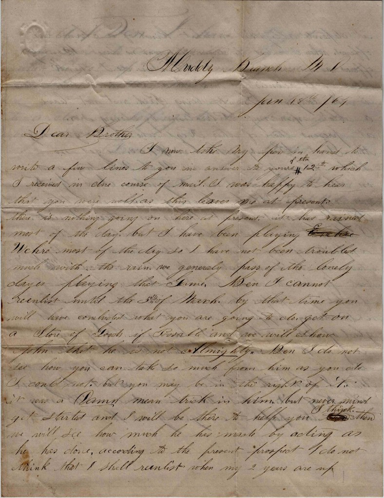 Ben, I cannot enlist until the 5th of March. By that time you will have concluded what you are going to do. Get on a store of goods if possible and we will show John that he is not Almighty. Ben, I do not see how you can take so much from him as you do. I could not. But you may be in the right of it. It was a damn mean trick in him but never mind. Get started and I will be there to help you I think. Then we will see how much he has made by acting as he has done. According to the present prospect, I do not think that I shall reenlist when my two years are up. It depends altogether on what kind of a chance is offered.