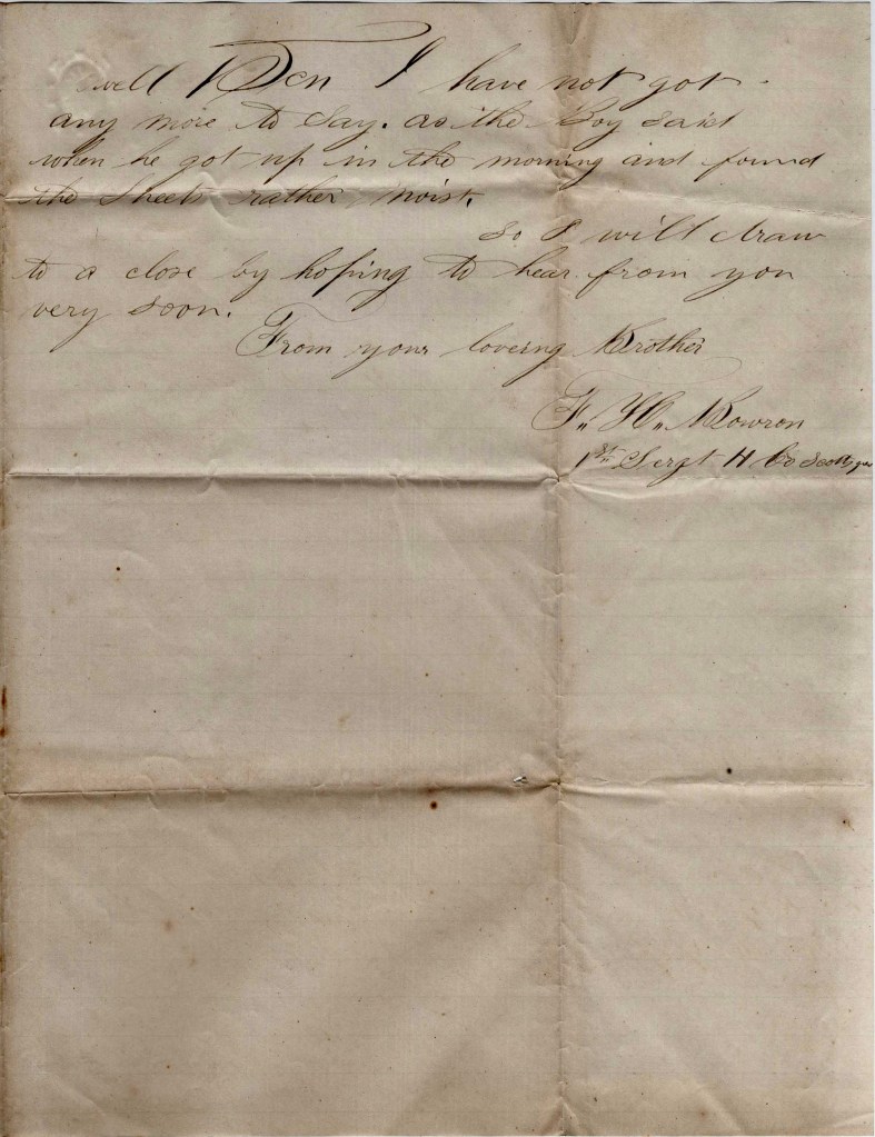 Well, Ben, I have not got any more to say as the Boy said when he got up in the morning and found the sheets rather moist. So I will draw to a close by hoping to hear from you very soon. From your loving brother, — F. H. Bowron, 1st Sergt., Co. H, Scotts 900.