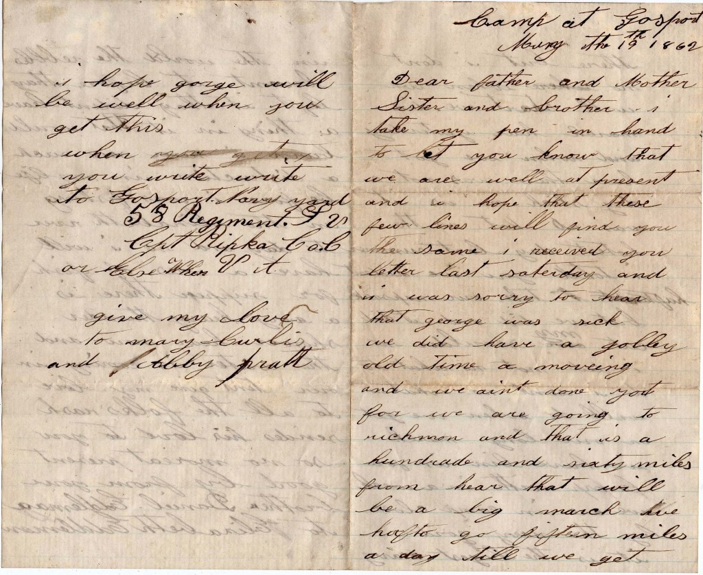 We did have a jolly old time a moving and we ain’t done yet for we are going to Richmond adn that is a hundred and sixty miles from here. That will be a big march. We have to go fifteen miles a day till we get there but I don’t know when we will start. We did march here yesterday and when we got here, there was not a dry stitch on us. It was as hot as the hottest day last summer. I told you we didn’t have to take our knapsacks but we did and it did cut my shoulder so I did not know what to do. I don’t know what I will do when we get our long march.