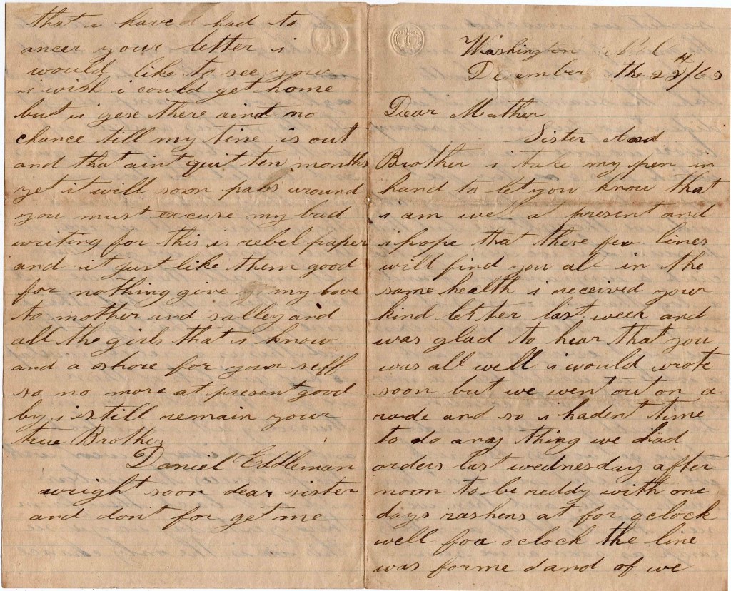 Write to Mr. Daniel Eddleman, Gosport Navy Yard, 58th Regiment P. V., Capt. Ripka, Co. C, Vol. Infantry, or elsewhere.