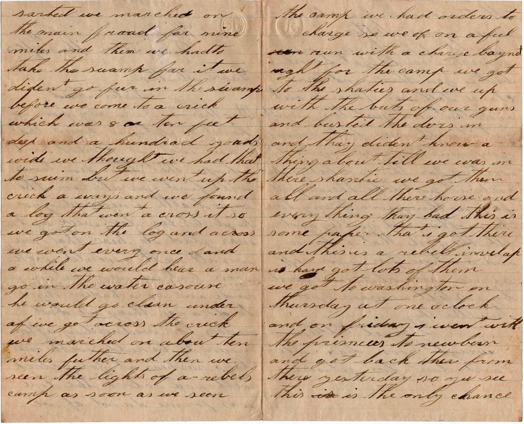 After we got across the crick, we marched on about ten miles further and then we seen the lights of a rebel’s camp. As soon as we seen the camp, we had orders to charge so we [went] off on a full run with a charge bayonet right for the camp. We got to the shanties and we up with the butts of our guns and busted the doors in, and they didn’t know a thing about [it] till we was in their shanties. We got them all and all their horses and everything they had. This is some paper that I got there and this is a rebel’s envelope. I have got lots of them.