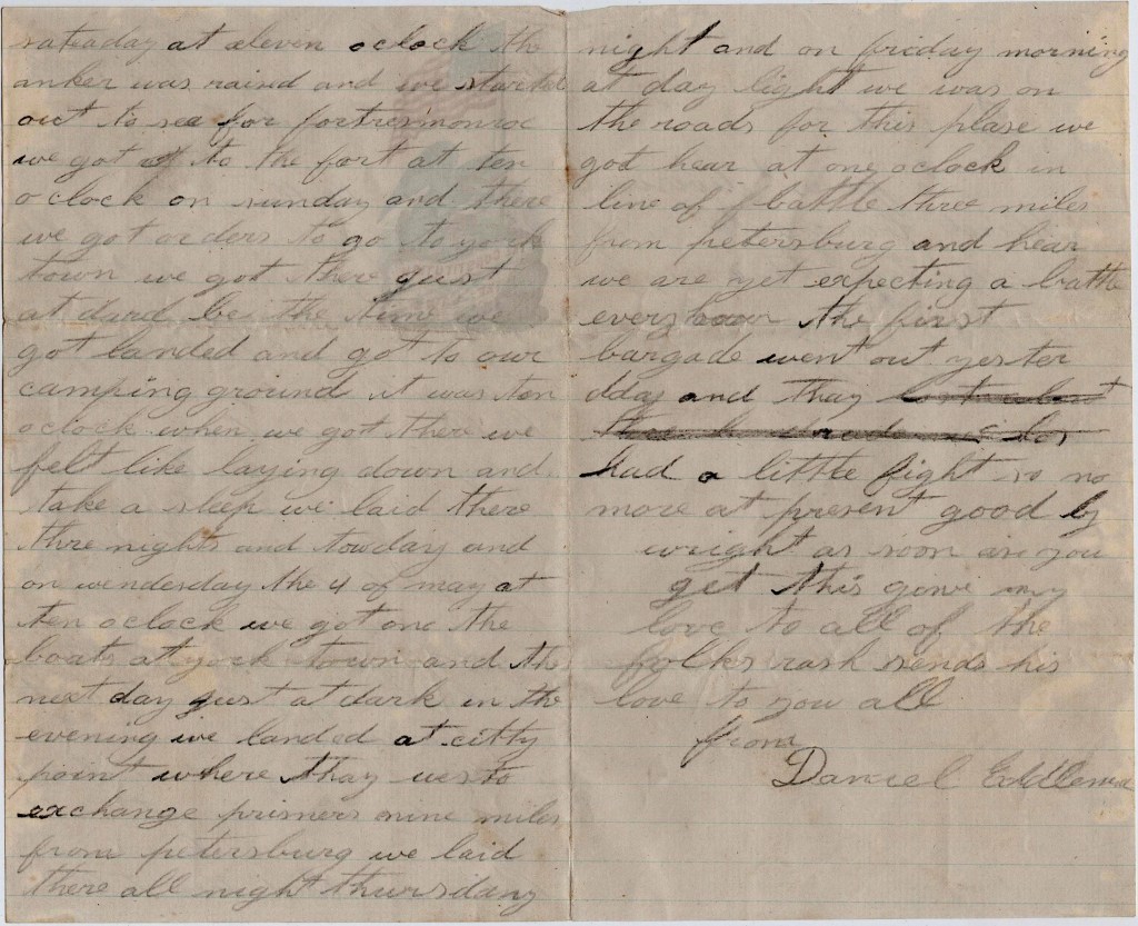 We laid there three nights and two days, and on Wednesday the 4th of May at ten o’clock, we got on the boats at Yorktown and the next day, just at dark in the evening, we landed at City Point where they was to exchange prisoners nine miles from Petersburg. We laid there all night Thursday night and on Friday morning at day light, we was on the road for this place. We got here at one o’clock in line of battle, three miles from Petersburg, and here we are yet, expecting a battle every hour. The First Brigade went out yesterday and they had a little fight.