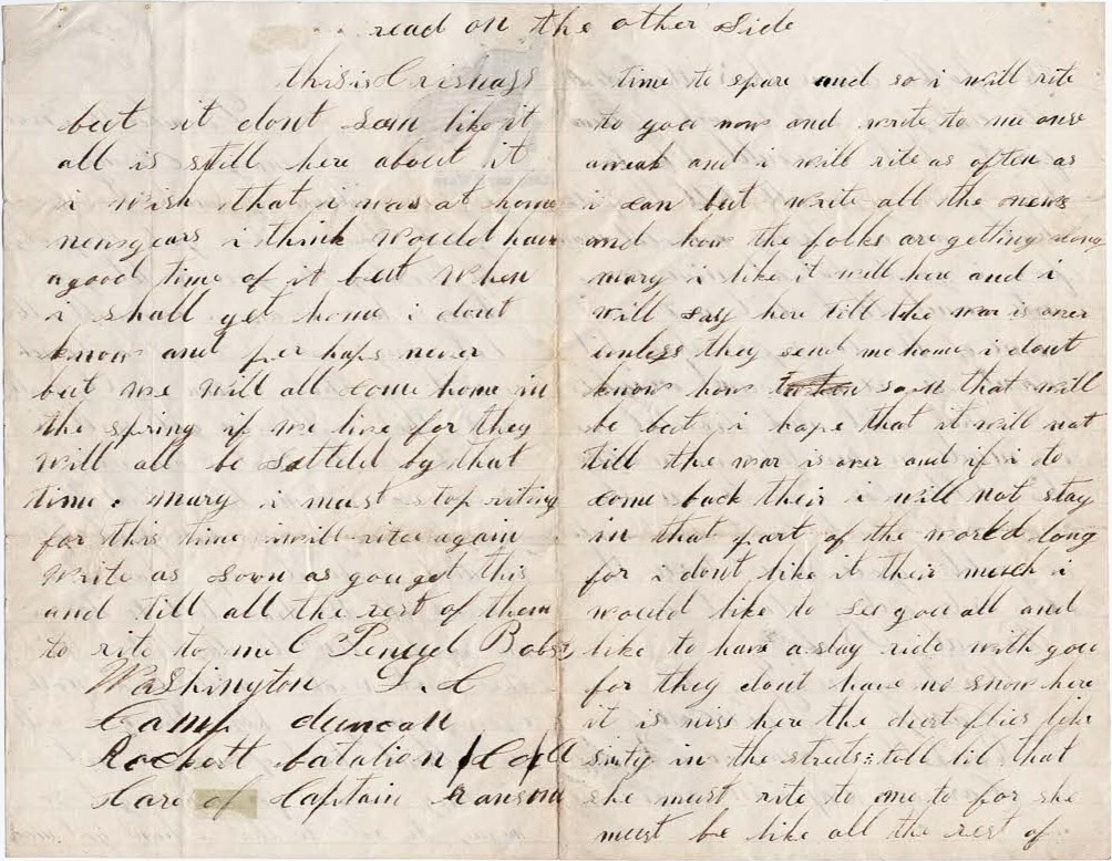 This is Christmas but it don’t seem like it. All is still here about. I wish that I was at home New Years. I think I would have a good time of it. But when I shall get home, I don’t know and perhaps never. But we will all come home in the spring if we live for they will all be settled by that time.