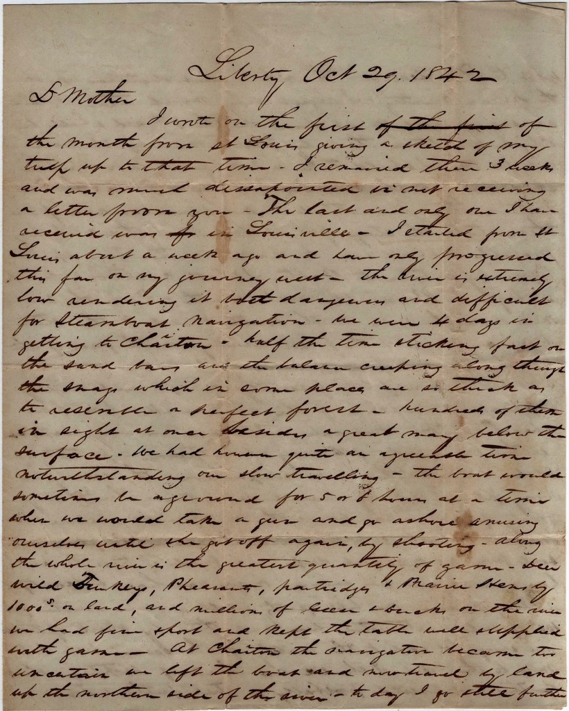 I started from St. Louis about a week ago and have only progressed this far on my journey west. The [Missouri] river is extremely low rendering it both dangerous and difficult for steamboat navigation. We were 4 days in getting to Chariton, half the time sticking fast on the sand bars and the balance creeping along through the snags which in some places are so thick as to resemble a perfect forest—hundreds of them in sight at once besides a great many below the surface. We had, however, quite an agreeable time notwithstanding our slow traveling. The boat would sometimes be aground for 5 or 6 hours at a time when we would take a gun and go ashore amusing ourselves—until she got off again—by shooting. Along the whole river is the greatest quantity of game, deer, wild turkeys, pheasants, partridges, & prairie hens by thousands on land, and millions of greenbacks on the river. We had fine sport and kept the table well supplied with game.