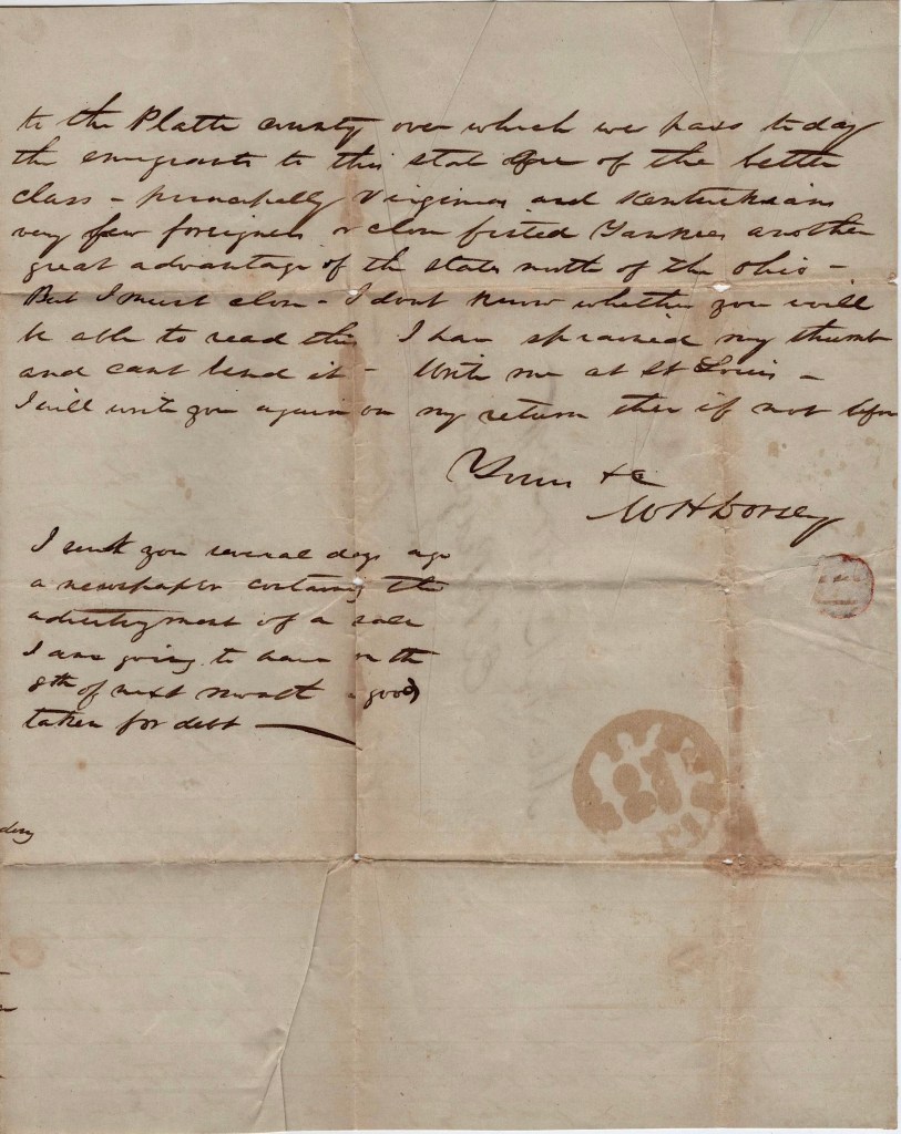 The emigrants to this state are of the better class—principally Virginia and Kentuckians. Very few foreigners or close-fisted Yankees—another great advantage of the states south of the Ohio. But I must close. I don’t know whether you will be able to read this. I have sprained my thumb and can’t bend it. Write me at St. Louis. I will write you again on my return then if not before. Yours &c. — W. H. Dorsey