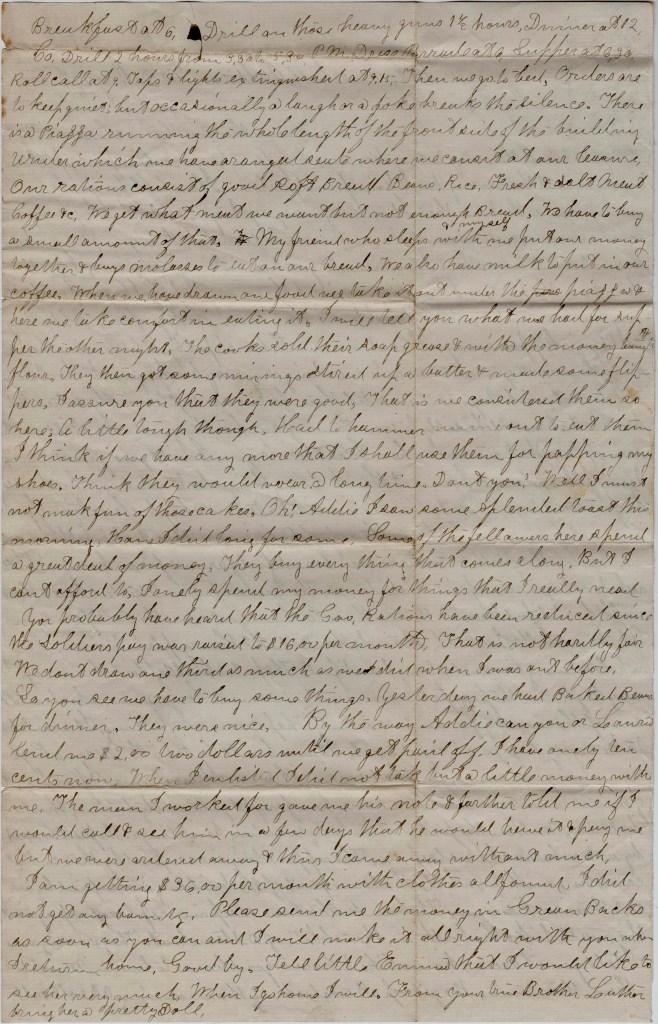 Our rations consist of government soft bread, beans, rice, fresh & salt meat, coffee, &c. We get what meat we want but not enough bread. We have to buy a small amount of that. My friend—who sleeps with me—and myself put our money together and buy molasses to eat on our bread. We also have milk to put in our coffee. When we have drawn our food, we take it out under the piazza & here we take comfort in eating it. I will tell you what we had for supper the other night. The cooks sold their soup grease & with the money bought flour. They then got some [ ], stirred up a batter and made some flippers. I assure you that they were good—that is, we considered them so here. A little tough though. Had to hammer mine out to cut them. I think if we have any more that I shall use them for popping my shoes. Think they would wear a long time, don’t you? Well I must not make fun of those cakes.