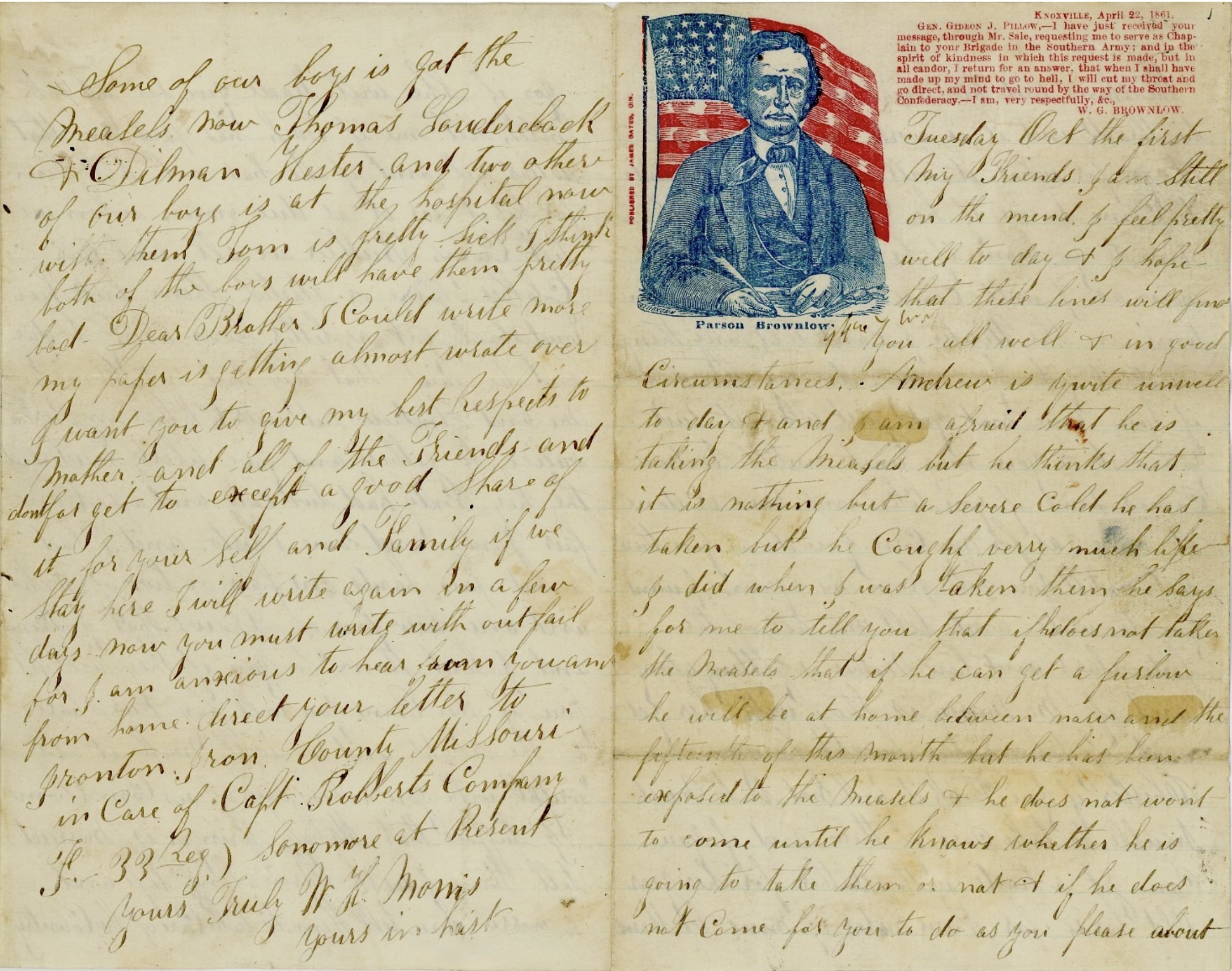 I am still on the mend. I feel pretty well today & I hope that these lines will find you all well & in good circumstances. Andrew is quite unwell today and I am afraid that he is taking the measles but he thinks that it is nothing but a severe cold he has taken but he coughed very much like I did when I was taken them. He says for me to tell you that if he does not take the measles that if he can get a furlough, he will be at home between now and the fifteenth of this month. But he has been exposed to the measles & he does not want to come until he knows whether he is going to take them or not, and if he does not come for you, to do as you please about thrashing out his wheat, If you get ready to thrash and it is worth anything, to let it go for what it will fetch. But he wants to come home if he can, and I want him to go home if he can for I don’t know as I will come home until some time in the winter. I can’t tell anything about it yet.