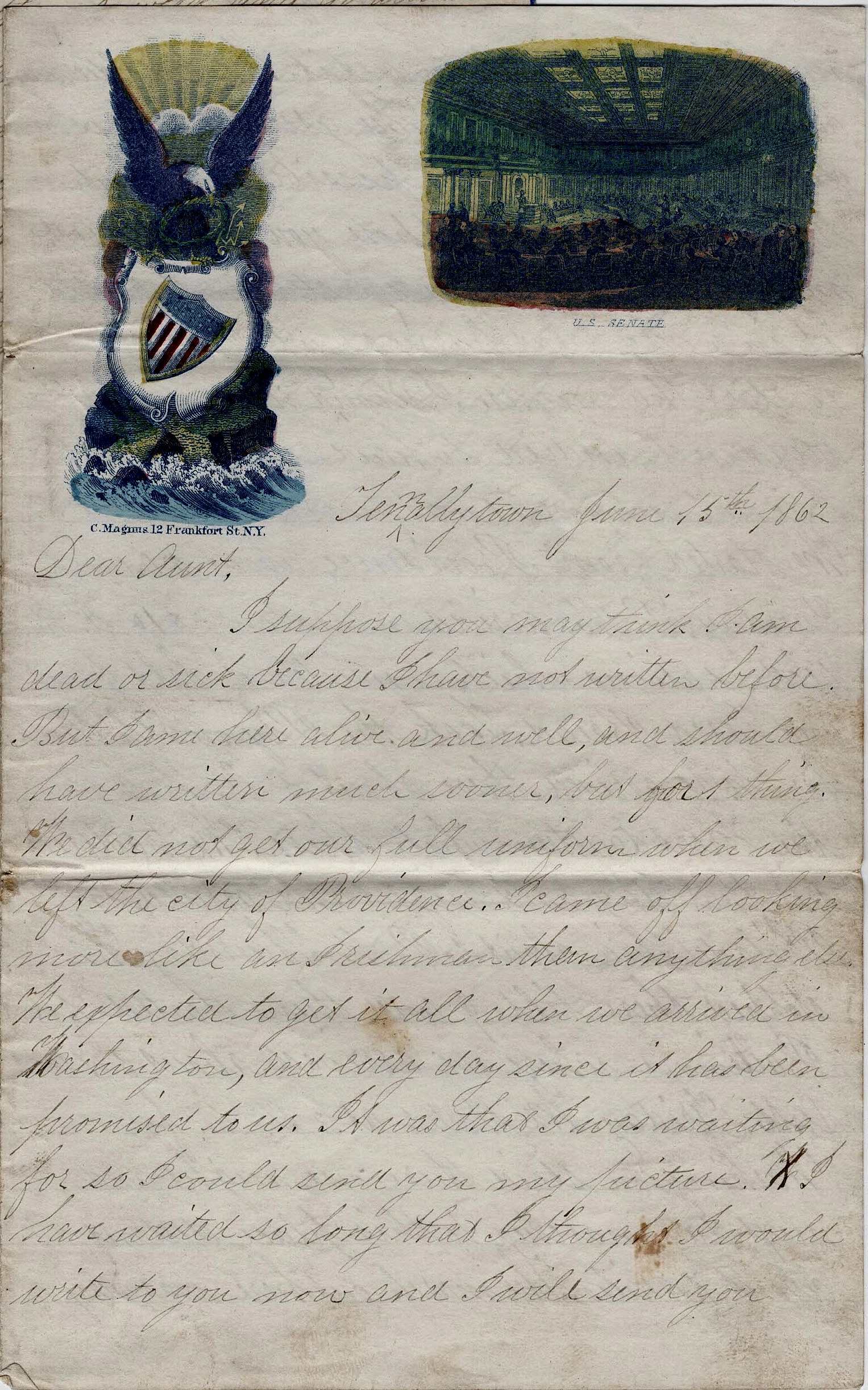 I suppose you may think I am dead or sick because I have not written before but I am here alive and well, and should have written much sooner but for 1 thing. We did not get our full uniform when we left the City of Providence. I came off looking more like an Irishman than anything else. We expected to get it all when we arrived in Washington, and every day since it has been promised to us. It was that I was waiting for so I send you my picture. I have waited so long that I thought I would write to you and I will send you my likeness when I can get it.