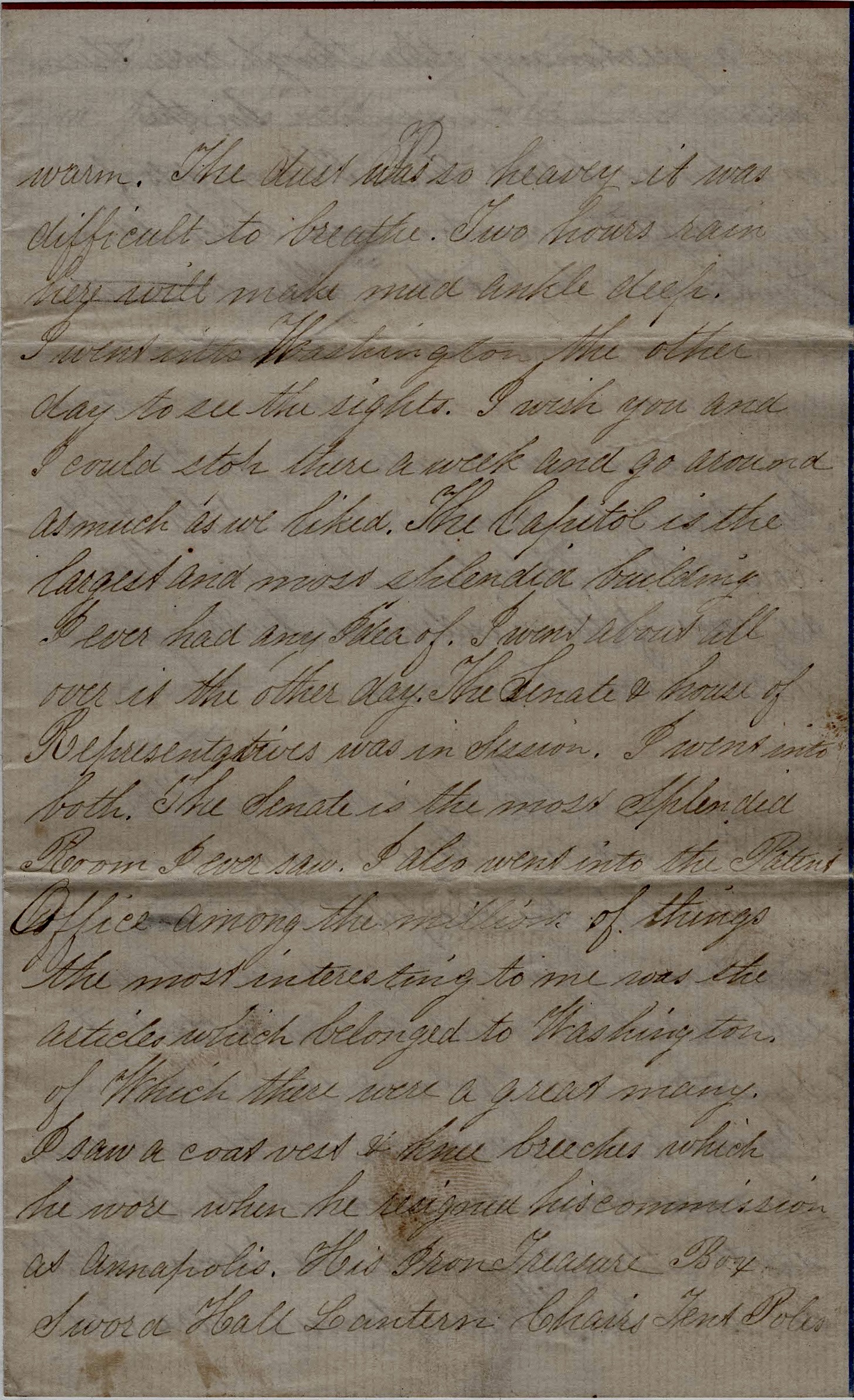 I went into Washington the other day to see the sights. I wish you and I could stop there a week and go around as much as we liked. The Capitol is the largest and most splendid building I ever had any idea of. I went about all over it the other day. The Senate and House of Representatives was is session. I went into both [chambers]. The Senate is the most splendid room I ever saw. I also went into the Patent Office, Among the millions of things, the most interesting to me was the articles which belonged to [General] Washington of which there were a great many. I saw a coat vest and knee breeches which he wore when he resigned his commission at Annapolis. His iron Treasure box, sword, hall lantern, chairs, tent poles, and a great many other things were there. I was very much disappointed in the machines I saw there. The models of some (a great many too) I should not think would be put there—they were made so cheap and common. But there was enough of interest in te room to interest me a month if I could only get there. I went into the reception room of the White House. It is furnished splendidly. There are some of the handsomest buildings in Washington I ever saw.