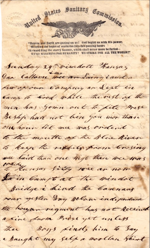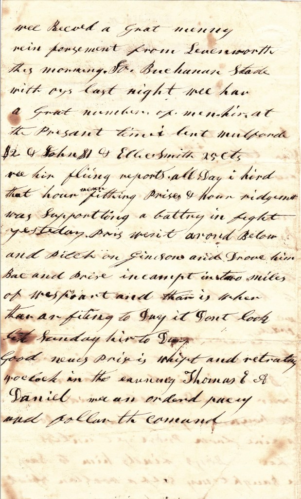 We hear flying reports all day. I heard that our men were fighting Price and our regiment was supporting a battery in fight yesterday. Price went around below and pitched on Jennison and drove him back and Price encamped [with]in two miles of Westport and that is where they are fighting today. It don’t look like Sunday here today.