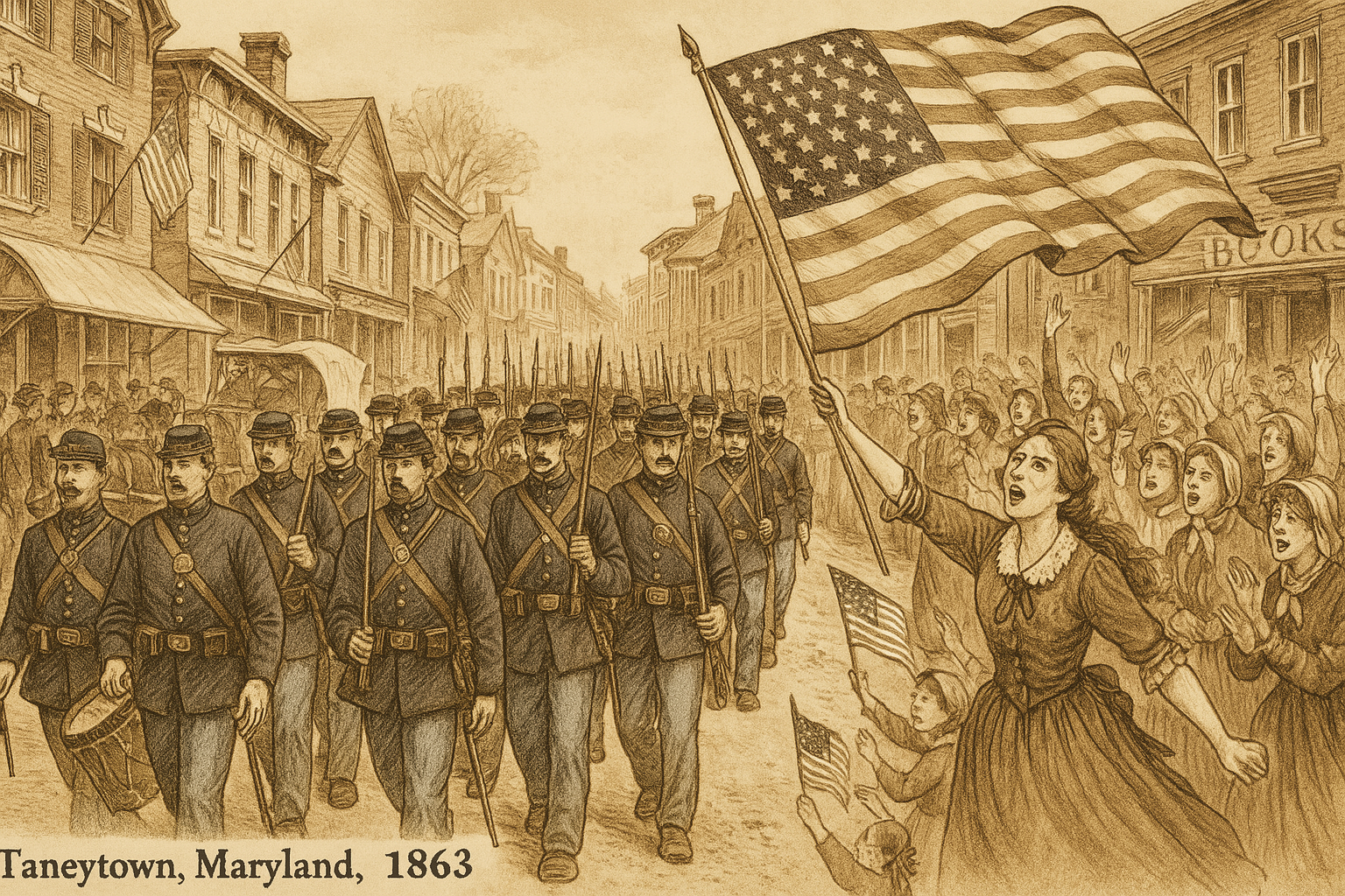Now I must tell you something about the times here. There was about two hundred thousand soldiers went through Taneytown. They destroyed a great deal of things through here but they didn’t destroy nothing for us. They were Union soldiers. I was in town one whole day looking at them a passing through and I didn’t see the quarter of them. Us girls sang and cheered them. They were all in good spirits and they said that Maryland was the pleasantest state that they ever was in. They said that they loved the very smiles of the women. They said if they didn’t get killed, they were a coming to Maryland to hunt their wives. They all acted like gentlemen. They were as decent a people as ever went through town. They encamped about a mile from our house. They had their guards placed out at our big gate looking for the rebels in every direction. They had their cannons planted between our house and town expecting a fight every minute but the rebels didn’t come closer than Bill Gilden till they were driven back.