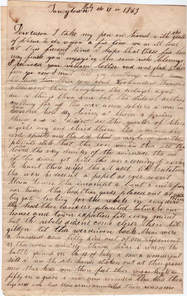 There were a hundred and fifty died out of one regiment as they were a coming through here. I was on the battleground on the 18th of July. I saw a wonderful sight. I saw the rebs hands sticking out of their graves, some their heads, some their feet. There was as high as fifty in a grave. I saw some wounded. They had their legs and some had their arms amputated. There was one poor creature was taking the lock jaw when I was there. They expected him to die and the rest of them was all lively.