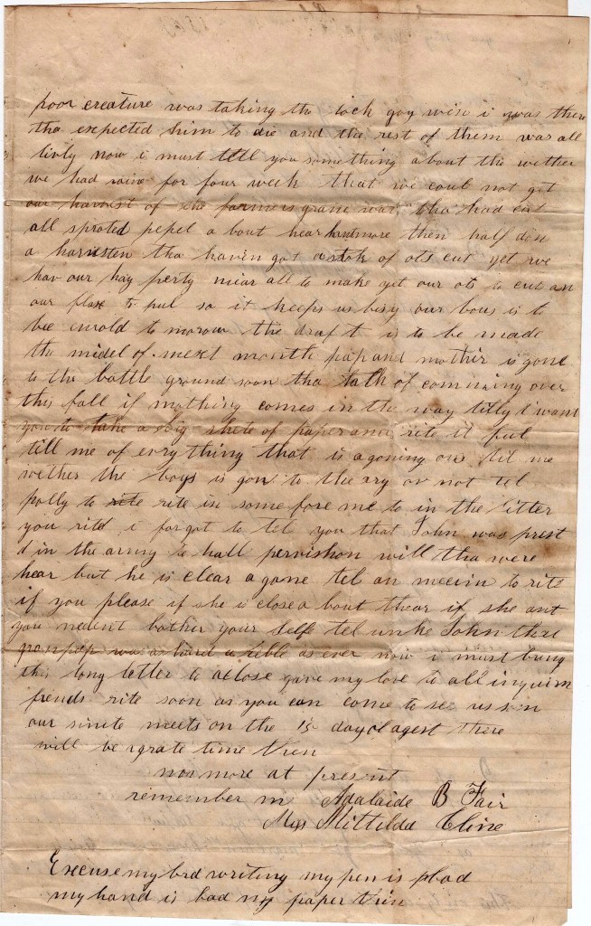 Our beaus is to be enrolled tomorrow. The draft is to be made the middle of next month. Pap and mother is going to the battle ground soon. They talk of coming over this fall if nothing comes in the way. Tilly, I want you to take a big sheet of paper and write it full. Tell me everything that is a going on. Tell me whether the boys is gone to the army or not. Tell Polly to write in some for me too in the letter you write. I forgot to tell you that John was pressed in the army to haul provision while they were here but he is clear again. Tell Aunt Maria to write if you please if she is close about there. If she and you needn’t bother yourself. Tell Uncle John that Grandpap was as hard a pebble as ever. Not I must bring this long letter to a close. Gove my love to all inquiring friends. Write soon as you can. Come to see us soon. Our Sinod meets on the 15th day of August. There will be a great time then. No more at present. Remember me. — Adalaide B. Fair