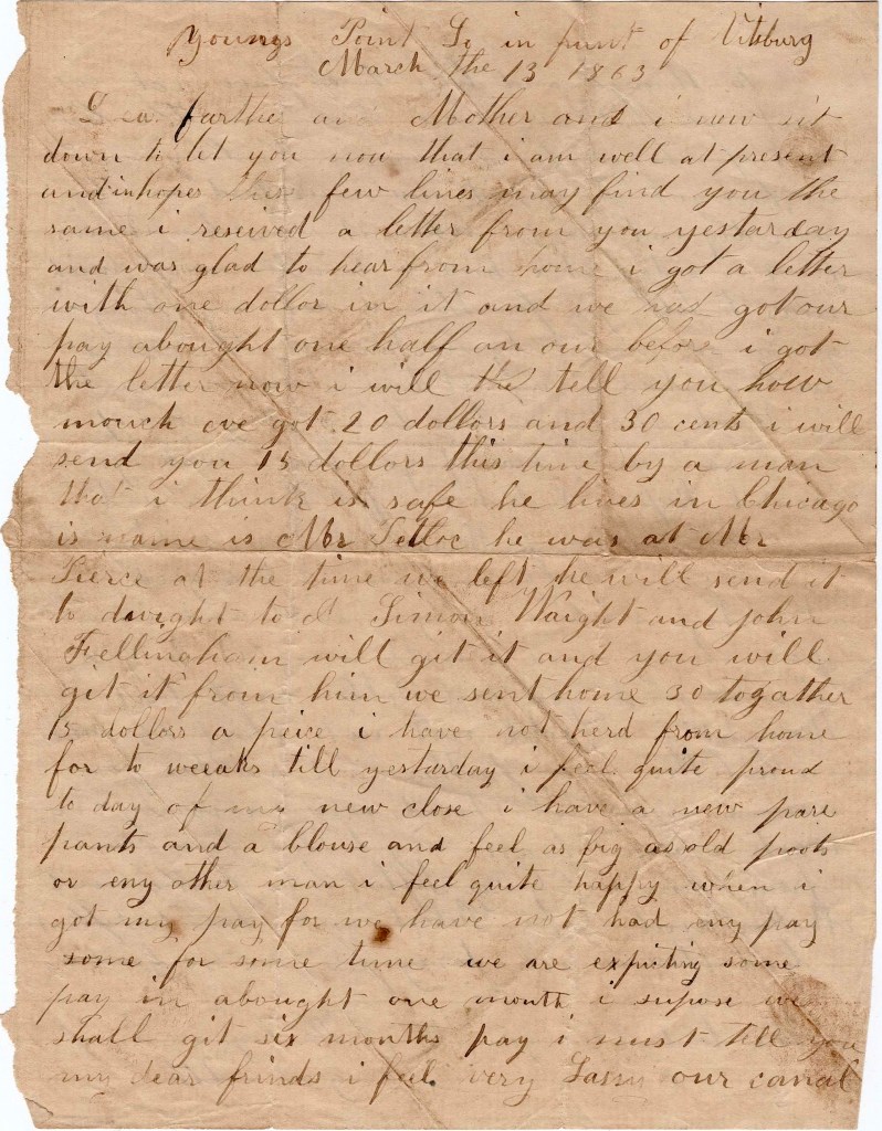 I now sit down to let you know that I am well at present and in hopes these few lines may find you the same. I received a letter from you yesterday and was glad to hear from home. I got a letter with one dollar in it and we had got our pay about one half an hour before I got the letter. Now I will tell you how much we got—$20 and 30 cents. I will send you 15 dollars this time by a man that I think is safe. He lives in Chicago. His name is Mr. Tetloc. He was at Mr. Pierce at the time we left. He will send it to Dwight to Simon Waight and John Fellingham will get it and you will get it from home. We sent home 30 together, 15 dollars apiece.