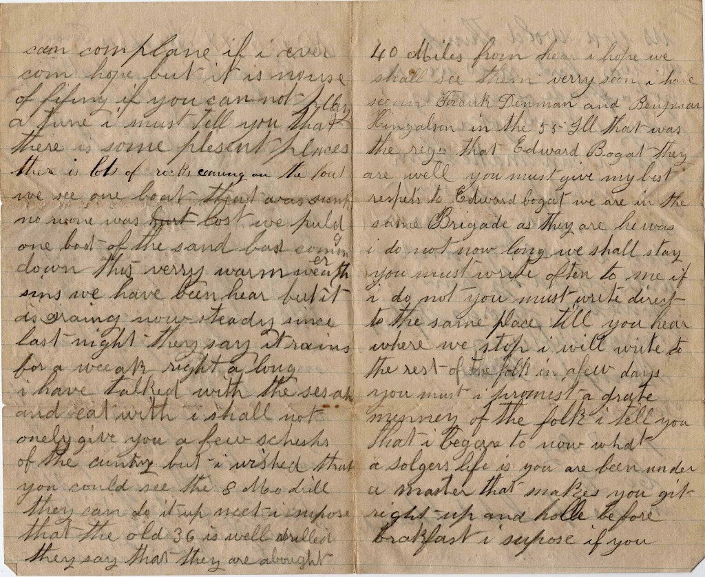 We have got to a stopping place and that is Memphis & close to the river, We was two days and two nights on the river with two or three hard crackers. Talk about living. That is no name for it. And one night we stopped on the shore of Missouri and we [ ] four hives of bees and two or three hogs and one heifer and then we started for Memphis so we got through with starving quite but I tell you, it was pretty hard us. But I can never complain if I ever come home. But it is no use of fifing if you cannot play a tune.