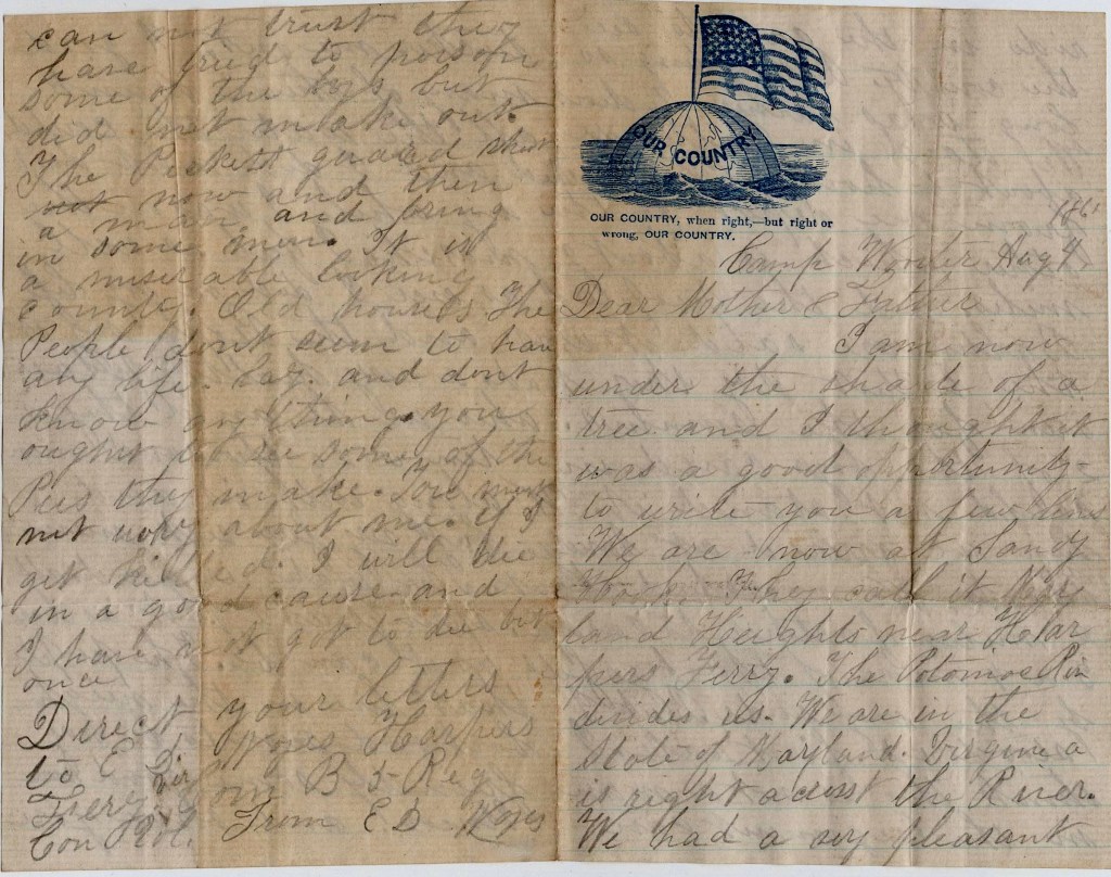 I am now under the shade of a tree and I thought it was a good opportunity to write you a few lines. We are now at Sandy Hook. They call it Maryland Heights near Harpers Ferry. The Potomac River divides us. We are in the State of Maryland. Virginia is right across the river.