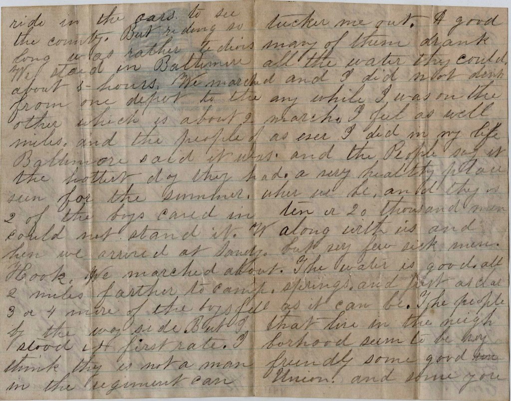 We had a very pleasant ride in the cars to see the country. But riding so long was rather tedious. 1 We stayed in Baltimore about 5 hours. We marched from one depot to the other which is about two miles and the people of Baltimore said it was the hottest day that had seen for the summer. Two of the boys caved in—could not stand it. When we arrived at Sandy Hook, we marched about two miles farther to camp. Three or four more of the boys fell by the wayside. But I stood it first rate. I think there is not a man in the regiment can tucker me out.