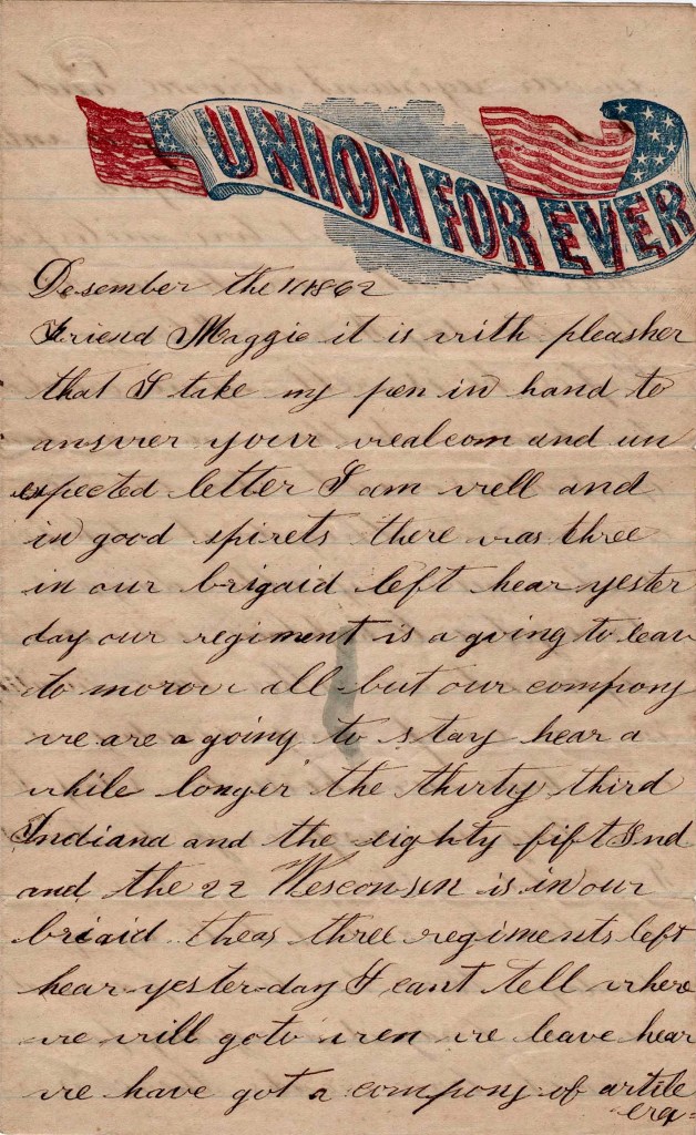 It is with pleasure that I take my pen in hand to answer your welcome and unexpected letter. I am well and in good spirits. There was three in our brigade left here yesterday. Our regiment is a going to leave tomorrow—all but our company. We are a going to stay here a while longer. The 33rd Indiana and the 85th Indiana and the 22nd Wisconsin is in our brigade. 1 These three regiments left here yesterday. I can’t tell where we will go to when we leave here.