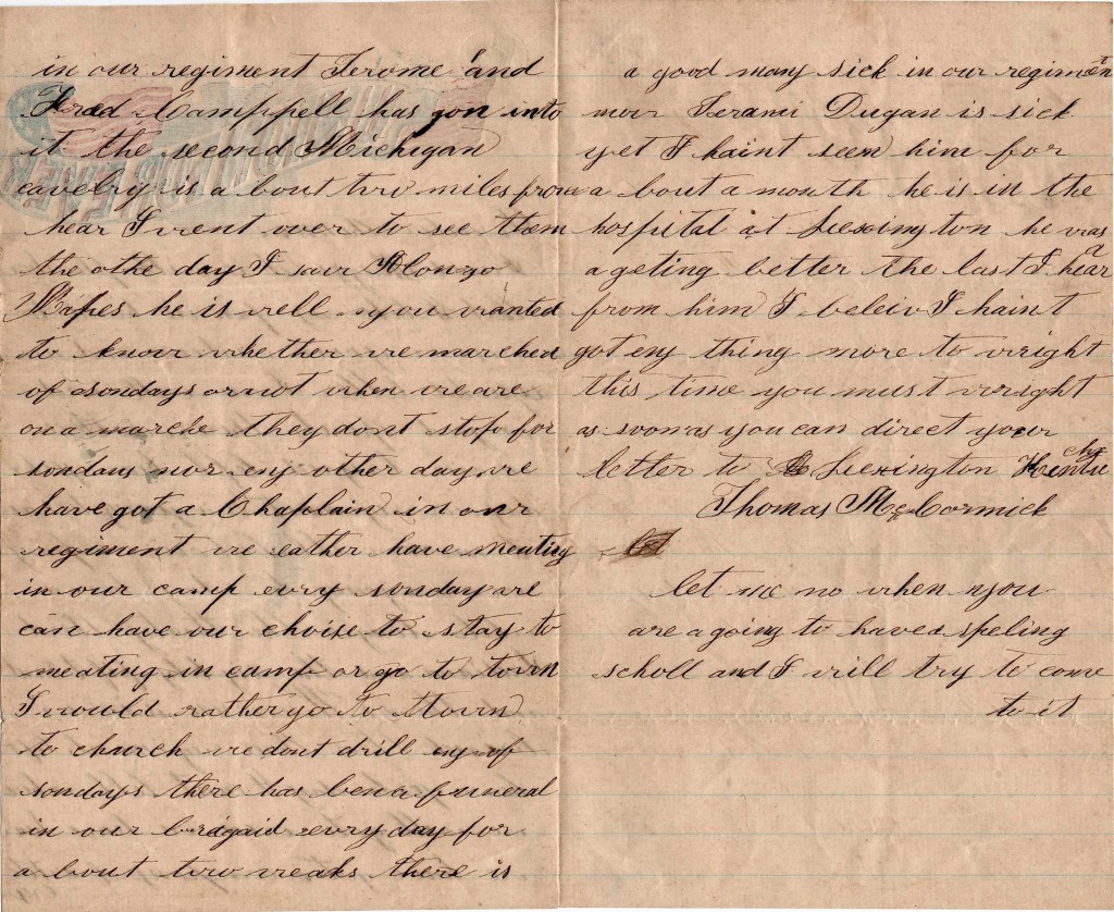 You wanted to know whether we marched on Sundays or not. When we are on a march, they don’t stop for Sundays nor any other day. We have got a chaplain in our regiment. We have meeting in our camp every Sunday. We can have our choice to stay to meeting in camp or go to town to church. We don’t drill any of Sundays. There has been a funeral in our brigade every day or about two weeks. There is a good many sick in our regiment. Mr. Jerome Dugan is sick yet. I hain’t seen him for about a month. He is in the hospital at Lexington. He was a getting better the last I heard from him. I believe I hain’t got anything more to write. As soon as you can, direct your letter to Lexington, Kentucky.