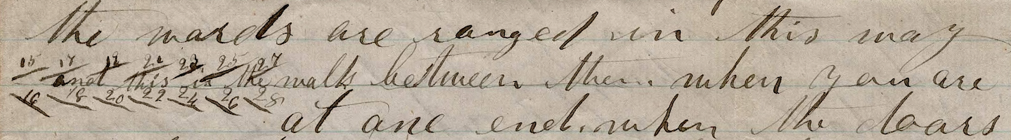 They have got a great long walk built from 16 clear up to 28. It looks about like a rope walk. The wards are [ar]ranged in this way [sketch] and this is the walk between them. When you are at one end, when the doors are all shut, you can’t hardly see out of the other end.