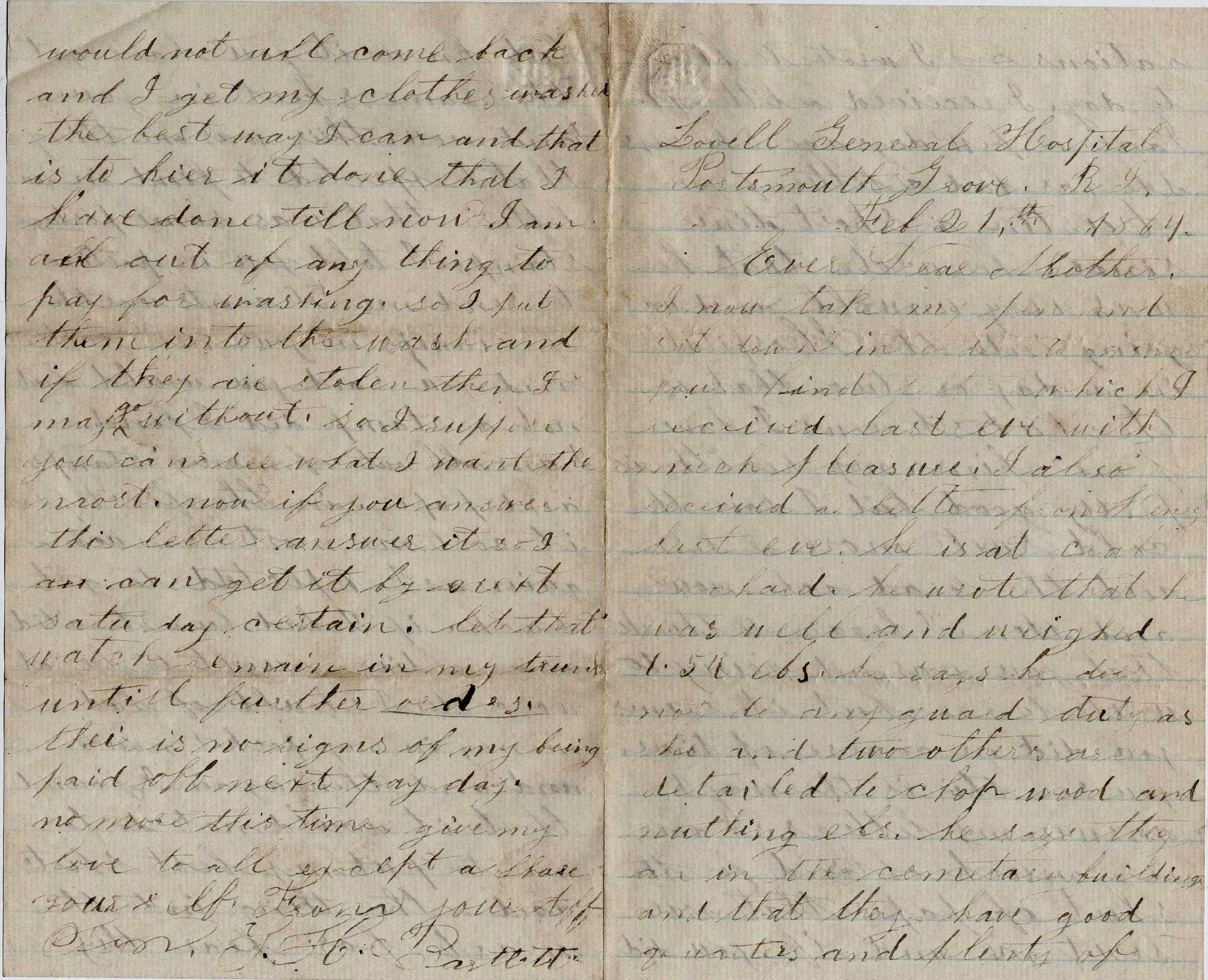 There was one thing that I expected to find in your letter. That was some postage stamps. I told you in oarticular to send me 50 cents worth of stamps in your next letter and you said you would. But not a stamp did I find. I am all out of money, stamps, and paper. In the first place, it costs me most as much again as I expected to get back. If I had been treated as a soldier, I should of had money in my pocket now. And then again, I found that it would not do for me to put my best shirts and other things into the wash for fear they would not all come back and I get my clothes washed the best way I can and that is to hire it done. That I have done until now. I am out of anything to pay for washing so I put them into the wash and if they are stolen, then I may go without.