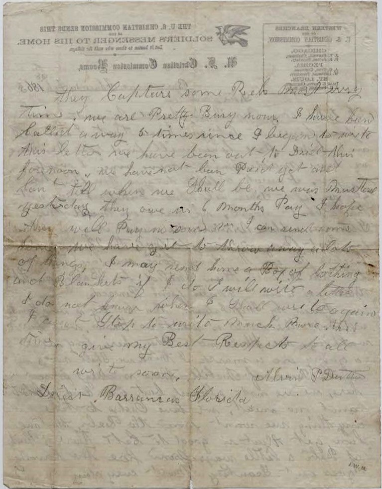 We are plenty busy now. I have been called away 5 times since I began to write this letter. We have been out to drill this forenoon. We have not been paid yet and can’t tell when we shall be. We was mustered yesterday. They owe us 6 months pay. I hope they will pay us soon so I can send some home. We have got to throw away a lot of things. I may send home a box of clothing and blankets. If I do, I will write a letter. I do not know when I shall write again. I can’t stop to write much more this time.