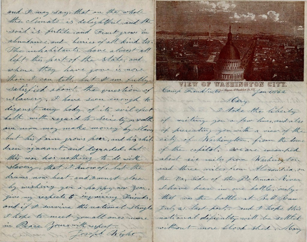 The inhabitants have almost all left this part of the state and where they have gone is more than I can tell but I am fully satisfied about the question of slavery. I have seen enough to disgust anybody of its evil effect, both with regard to society or wealth. A man may make money by slaves but his farm grows poor and his children ignorant and degraded. But this war has nothing to do with slavery that I know of. But the drums now beat and I must close by wishing you a happy New Year. Give my respects to enquiring friends and if I survive this national struggle, I hope to meet you all once more in peace. Yours with respects, – Joseph Wight