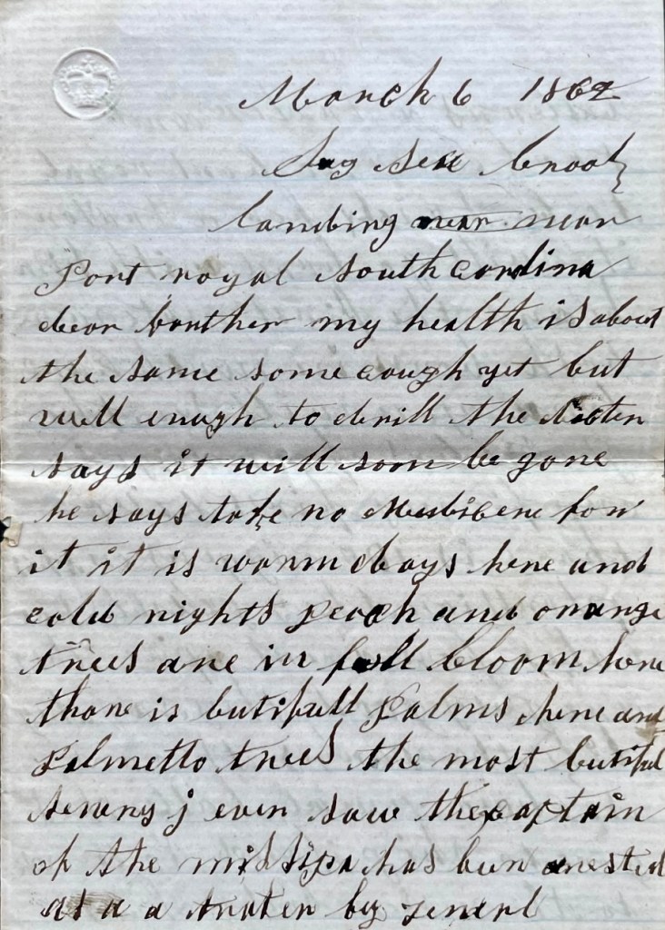 My health is about the same. Some cough yet but well enough to drill. The doctor says it will soon be gone. He says take no medicine now. It is warm days here and cold nights. Peach and orange trees are in full bloom here. There is beautiful palms here and palmetto trees. The beautiful scenery I ever saw. The captain of the militia has been arrested by General Butler as a traitor and took down to Port Royal to be tried for a traitor. It will go hard with him. He and the first mate were both born in North Carolina. You will see the particulars of our voyage in my first letter.