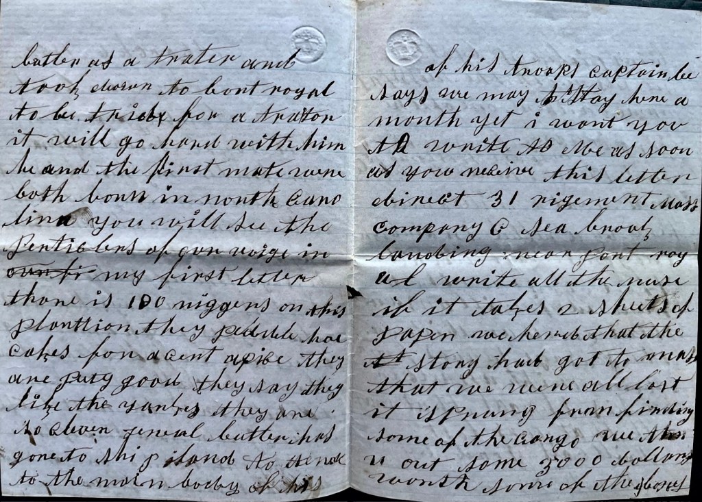 There is 100 niggers on this plantation. They peddle hoecakes for a cent apiece. They are pretty good. They say they like the Yanks. They are [ ]. Gen. Butler has gone to Ship Island to the main body of his troops. Captain B. says we may stay here a month yet. I want you to write to me as soon as you receive this letter. Direct to 31st Regiment Massachusetts. Company C, Seabrook Landing near Port Royal.