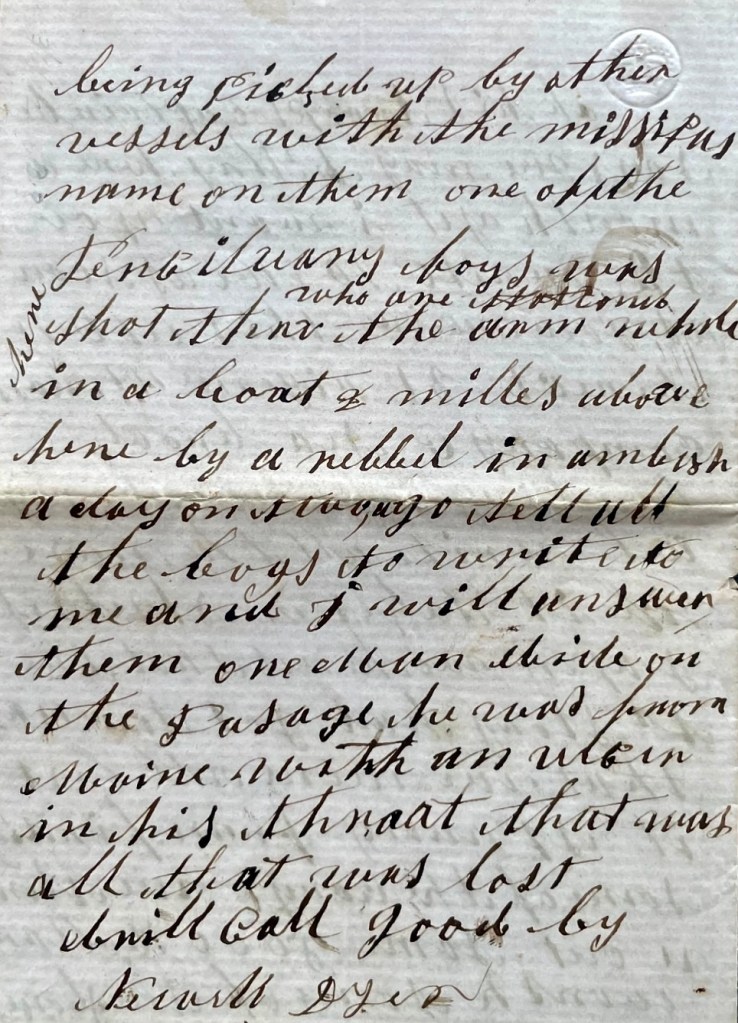 One of the Pennsylvania boys was shot through the arm while in a boat two miles above here by a rebel in ambush a day or two ago. Tell all the boys to write to me and I will answer them. One man died on the passage. He was from Maine with an ulcer in his throat that was all that was lost. I will call goodbye, — Newell Dyer