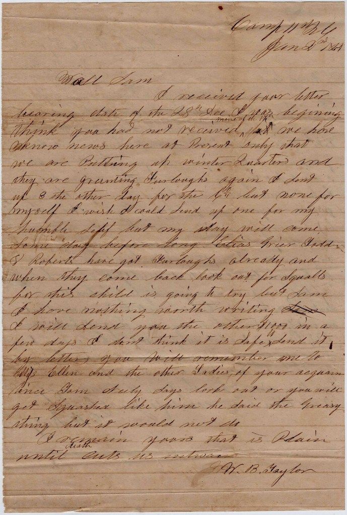 Well Sam, I received your letter bearing date of the 28th December. I was beginning to[to] think you had not received mine of the 17th. We have no news here at present—only that we are putting up winter quarters and they are granting furloughs again. I sent up 8 the other day for the company but none for myself. I wish I could send up one for my humble self but my day will come someday before long. Elias Grier Todd L Roberts have got furloughs already and when they come back, look out for Squalls for this shild is going to try. But Sam, I have nothing worth writing.