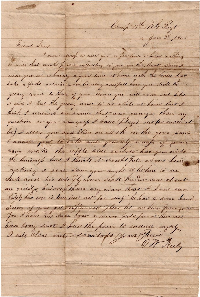 Thomas W. Neely (1843-1910) of Charlotte, Mecklenburg county, appears to have accepted a $50 bounty and volunteered to serve in the 11th North Carolina at an earlier date than William Taylor—February 1862. He was elected the 5th Sergeant of Co. A in June 1862 and promoted to 4th Sergeant in June 1863. He was wounded at the Battle of Gettysburg and the July/August 1863 muster roll carried him as “Wounded. At home with leave.” He did not return to the regiment until 17 December 1863, just two weeks before this letter was written. The May and June Muster report reported Thomas “At home on wounded furlough” for a second time (a gunshot wound to the left thigh), and this time it looks like he did not return to the regiment but was detached and assigned duty in Richmond. Like Taylo, he was also paroled at Appomattox in April 1865.
