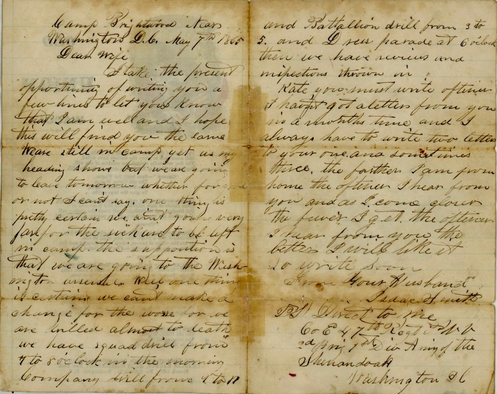 This letter was written by Isaac Smith (1842-1928) while serving in Co. E, 47th Pennsylvania Veteran Volunteers. Isaac had previously served in Co. K, 153rd Pennsylvania Infantry, enlisting in October 1862. He was wounded on 2 July 1863 at Gettysburg and mustered out of the regiment shortly after. In December 1863, Isaac reenlisted in the 47th Pennsylvania. His regiment was the only one from Pennsylvania to fight in Nathaniel Bank’s Red River Campaign. The regiment later distinguished itself under Sheridan in the Shenandoah Valley Campaign.
