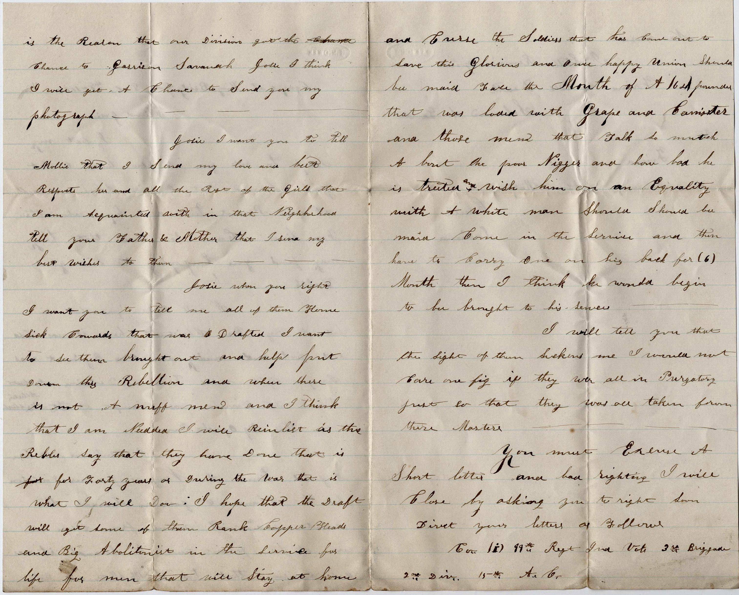Josie, when you write, I want you to tell me all of them homesick cowards that was drafted I want to see them brought out and help put down this Rebellion and when there is not enough men and I think that I am needed. I will reenlist as the rebs say that they have done. That is for forty years or during the war. That is what I will do. I hope that the draft will get some of them rank Copperheads and Big Abolitionists in the service for life for men that will stay at home and curse the soldiers that has come out to save this glorious and once happy Union should be made [to] face the mouth of a 64-pounder that was loaded with grape and canister. And those men that talk so much about the poor Nigger and how bad he is treated and wish him on an equality with a white man should be made to come in the service and then have to carry one on his back for six months. Then I think he would begin to be brought to his senses. I will tell you that the sight of them sickens me. I would not care one fig if they was all in purgatory just so that they was all taken from their masters.