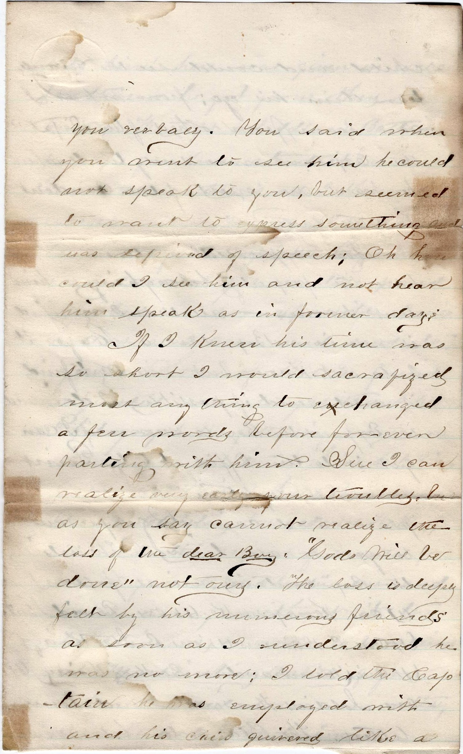 My feelings was very much depressed after the first night on account of something you might call foolish, but will tell you verbally. You said when you went to see him he could not speak to you, but seemed to want to express something and was deprived of speech. Oh how could I see him and not hear him speak as in former days. If I knew his time was so short, I would sacrificed most anything to exchange a few words before forever parting with him. Sue, I can realize very early your troubles, but as you say cannot realize the loss of the dear boy, “Gods will be done,” not ours. The loss is deeply felt by his numerous friends. As soon as I understood he was no more. I told the Captain he was employed with and his chin quivered like a child and could see the manly tear dim his eye. From what I can learn from others of the Department, the Captain was sorely tired when he heard the news of the accident save the latter.