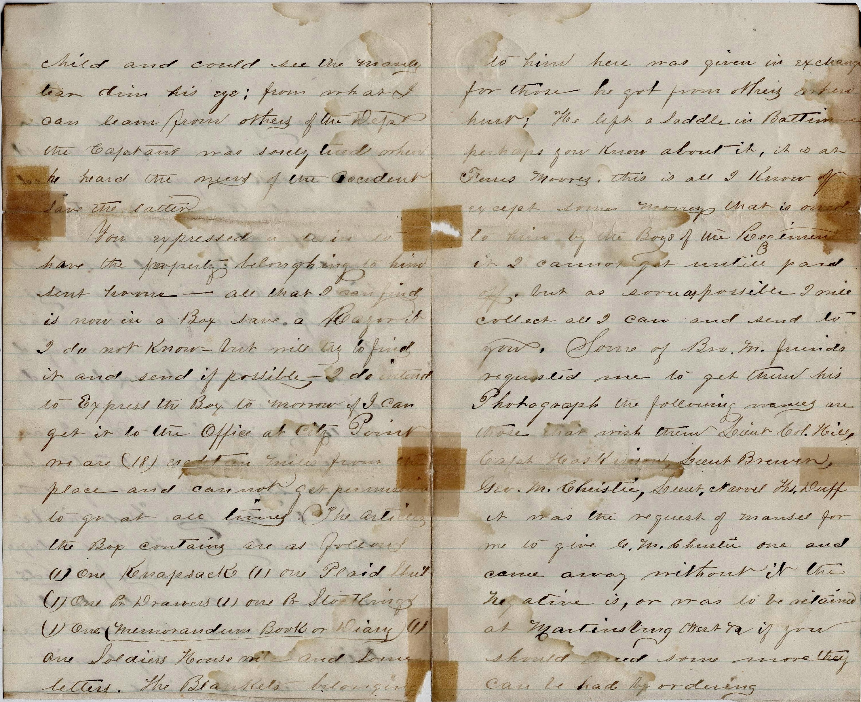 You expressed a desire to have the property belonging to him sent home. All that I can find is now is a box save a razor. It, I don’t know but will try to find it and send if possible. I do intend to express the box tomorrow if I can get it to the office at City Point. We are eighteen miles from the place and cannot get permission to go at all times. The articles the box contains are as follows—one knapsack, one plaid shirt, one pair drawers, one pair stockings, one memorandum book or diary, one soldier’s housewife, and some letters. The blankets belonging to him here was given in exchange for those he got from others when hurt. He kept a saddle in Baltimore. Perhaps you know about it. It is at Ferris Moore’s. This all I know of except some money that is owed to him by the boys of the regiment. If I cannot get until paid off but as soon as possible I will collect all I can and send to you.