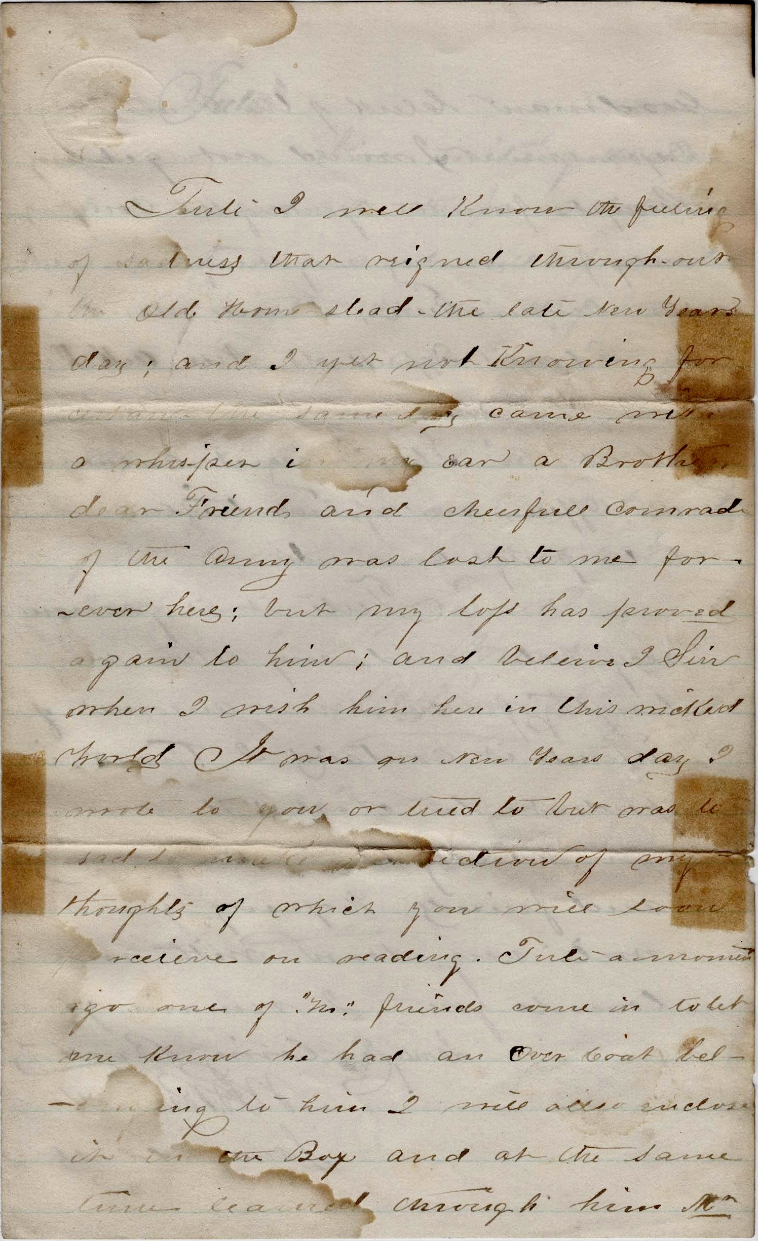 Tute, I well know the feeling of sadness that reigned throughout the old homestead the late New Years Day, and I yet not knowing for certain the same day came with a whisper in my ear a Brother, dear Friend and cheerful comrade of the army was lost me, forever here; but my loss has proved again to him; and I believe I sin when I wish him here in this wicked world. It was on New Years Day I wrote to you or tried to but was too sad to make [ ] of my thoughts of which you will soon receive on reading. Tute, a moment ago one of “no.” friends come in to let me know he had an overcoat belonging to him. I will also enclose it in the box and at the same time leaned through him Mr. Goodman, clerk of the Commissary Department, [that] I would not get any receipts from the agent of the company—only for money. Everything else at the owner’s risk. I will send it by Adams Express to Newark, Delaware.