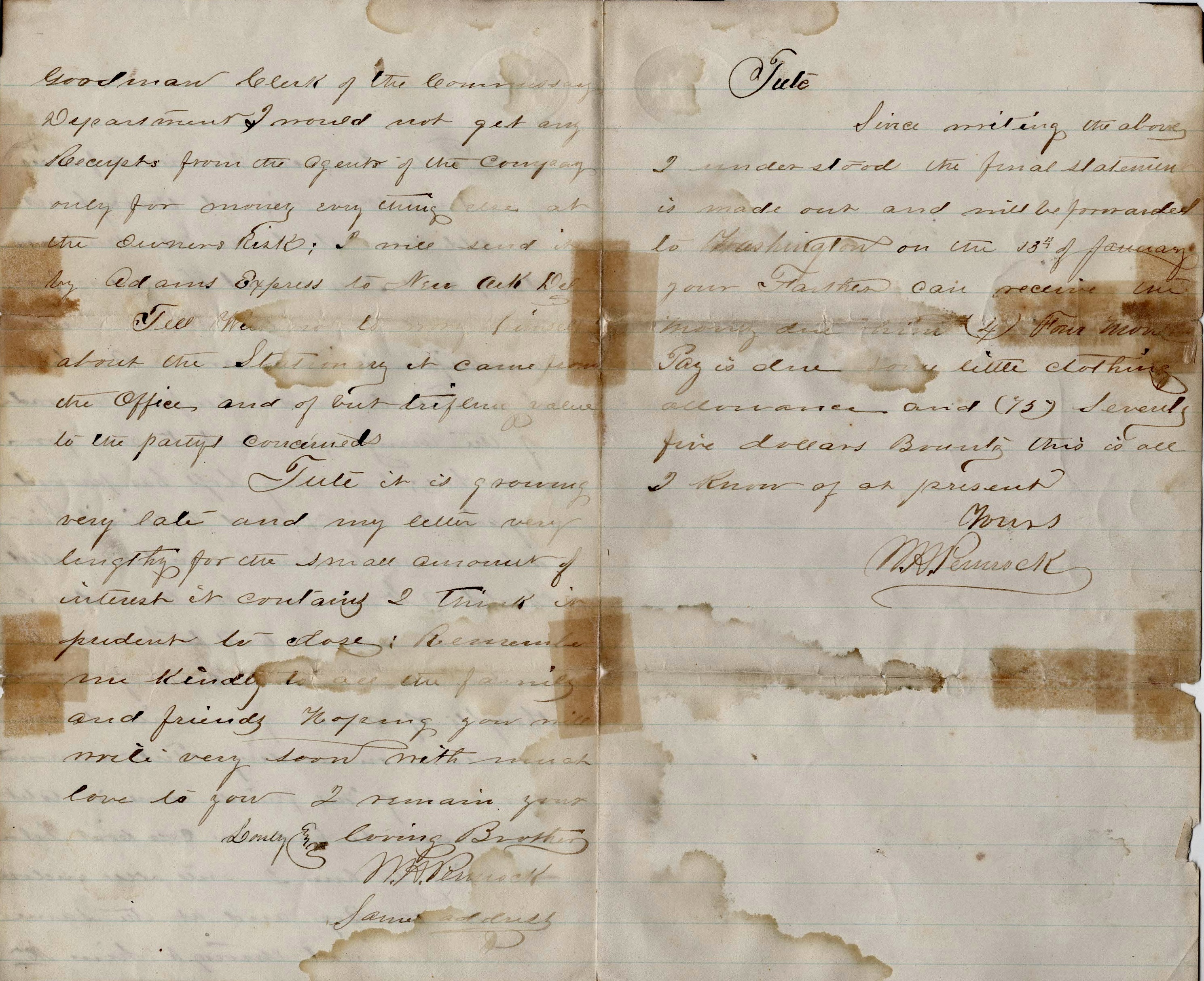 Tute, since writing the above, I understood the final statement is made out and will be forwarded to Washington on the 13th of January. Your Father can receive the money due him. Four months pay is due. Very little clothing allowance and 75 dollars bounty. This is all I know at present. Yours, — W. H. Pennock