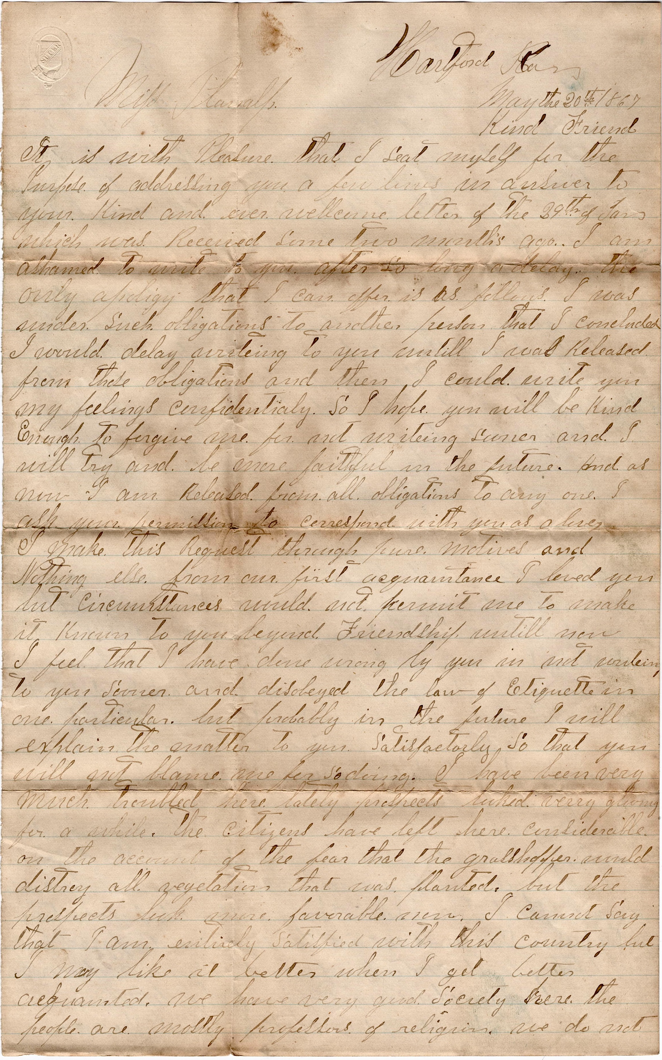 It is with pleasure that I seat myself for the purpose of addressing you a few lines in answer to your kind and ever welcome letter of the 29th of January which was received some two months ago. I am ashamed to write to you after so long a delay. The only apology that I can offer is as follows. I was under such obligations to another person that I concluded I would delay writing to you until I was released from those obligations and then I could write you my feelings confidentially, So I hope you will be kind enough to forgive me for not writing sooner and I will try and be more faithful in the future. And as now I am released from all obligations to anyone, I ask you permission to correspond with you as a lover. I make this request through pure motives and nothing else. From our first acquaintance I loved you but circumstances would not permit me to make it known to you beyond friendship until now. I feel that I have done wrong by you in not writing to you sooner and disobeyed the law of etiquette in one particular, but probably in the future I will explain the matter to you satisfactorily so that you will not blame me for so doing.
