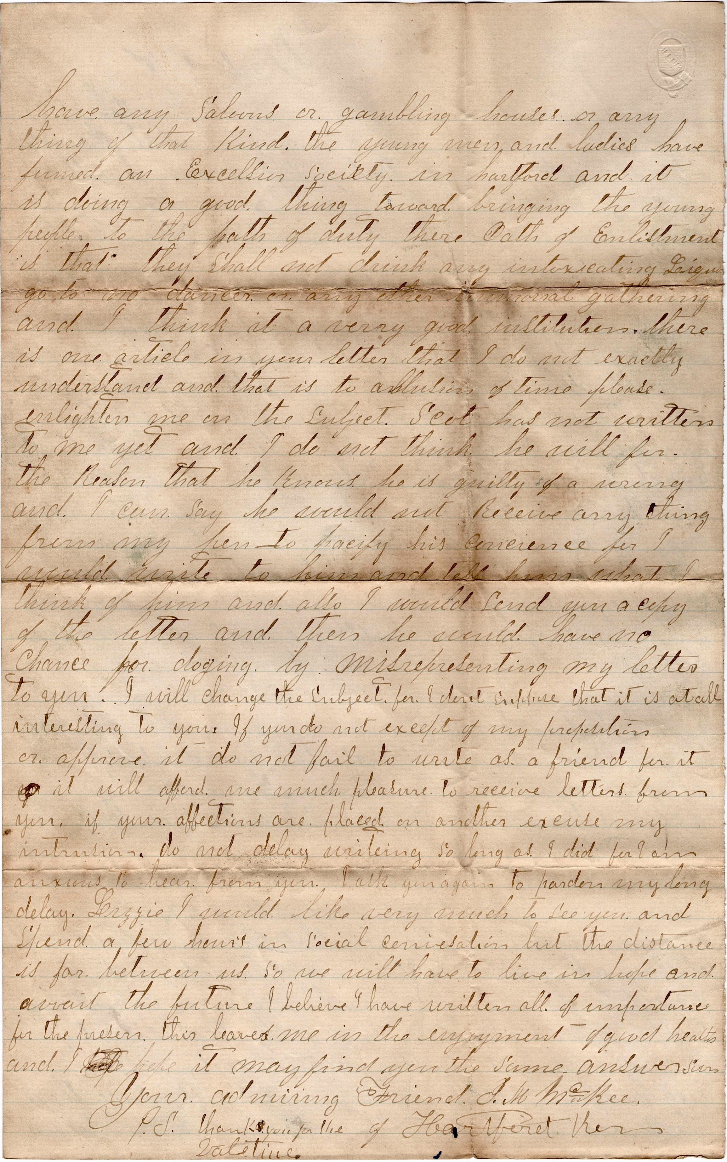 I will change the subject for I don’t suppose that it is at all interesting to you. If you do not accept of my proposition or approve it, do not fail to write as a friend for it will afford me much pleasure to receive a letter from you. If your affections are placed on another, excuse my intrusion. Do not delay in writing so long as I did for I am anxious to hear from you. I ask you again to pardon my long delay. Lizzie, I would like very much to see you and spend a few hours in social conversation but the distance is far between us so we will have to live in hope and await the future. I believe I have written all of importance for the present. This leaves me in the enjoyment of good health and I hope it may find you the same. Answer soon. Your admiring friend, — J. M. McKee of Hartford, Kansas