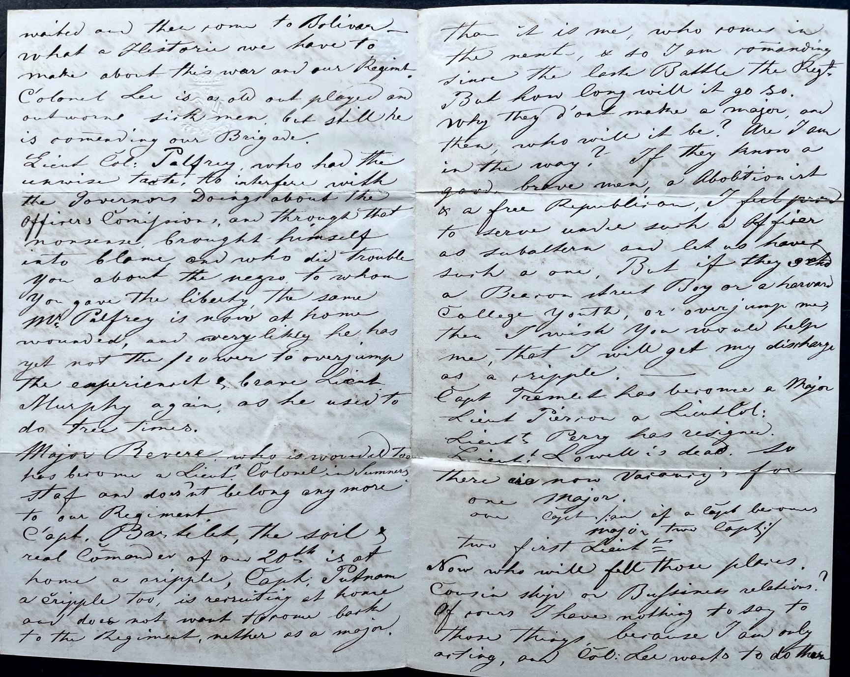 Major [Paul J.] Revere who is wounded too has become a Lieut. Colonel in Sumner’s staff and doesn’t belong anymore to our regiment. Capt. [William F.] Bartlett, the soul & real commander of our 20th is at home a cripple. Capt. [William Lowell] Putnam a cripple too, is recruiting at home and does not want to come back to the regiment, neither as a Major. Then it is to me who comes in the next & so I am commanding—since the last battle—the regiment. But how long will it go so. Why they don’t make a Major, and then, who will it be? Am I in the way? If they know a good, brave man, a abolitionist & a free Republican, I feel proud to serve under such an officer as subaltern and let us have such a one. But if they choose a Beacon Street boy or a Harvard College youth, or overjump me, then I wish you would help me that I will get my discharge as a cripple.