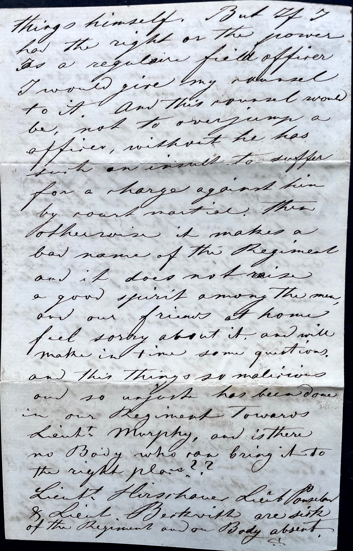 Capt. [Henry Martyn Tremlett has become a Major. Lieut. [Charles Lawrence] Pierson a Lieutenant-Colonel. Lieut. [George E.] Perry has resigned. Lieut. [James Jackson] Lowell is dead. So there are now vacancies for one Major; one Captain, or if Capt. becomes Major, two Captains; two First Lieutenants. Now who will fill those places? Cousinship or business relations? Of course I have nothing to say to those things because I am only acting, and Colonel Lee wants to do the things himself. But if I had the right or the power as a regular field officer, I would give my counsel to it. And this counsel would be not to overjump an officer without he has such an insult to suffer for a charge against him by court martial. Then, otherwise, it makes a bad name of the regiment and it does not raise a good spirit among the men and our friends at home feel sorry about it and will make in time some questions. And this thing so malicious and so unjust has been done in our regiment towards Lieut. Murphy and is there no body who can bring it to the right place??
