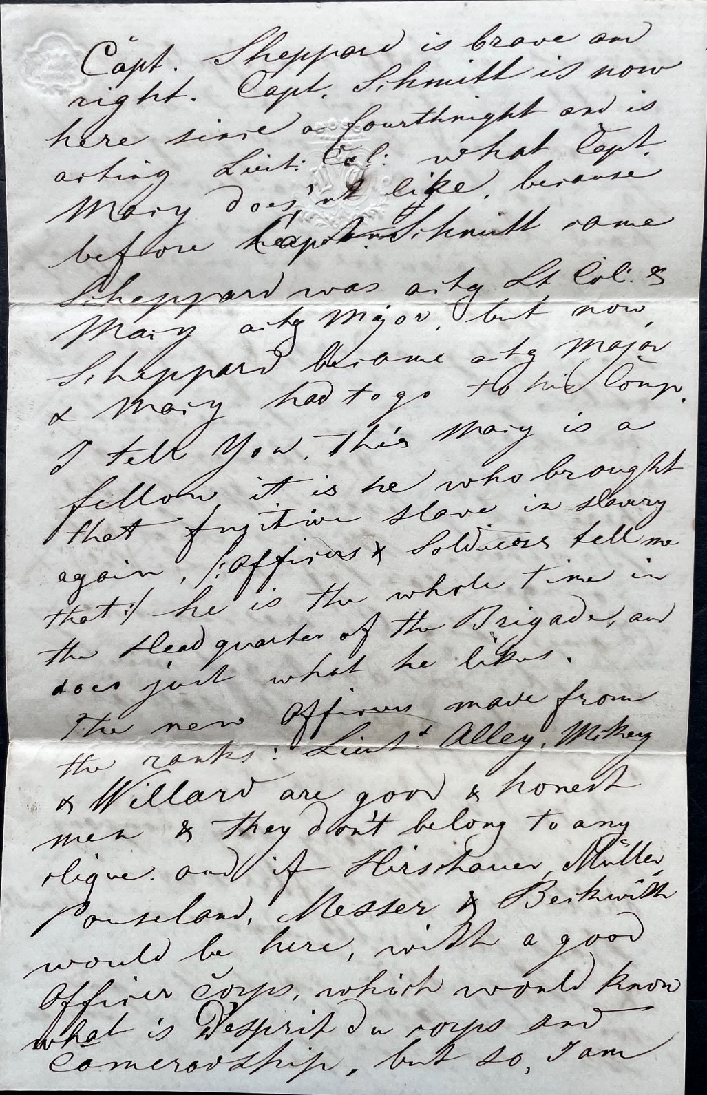 Lieut. Hirsthaver, Lieut. Panselar & Lieut. Berkwith are sick of the regiment and in body absent. Capt. [Allen] Shephard is brave and right. Capt. [George Adam] Schmitt is now here since a fortnight and is acting Lieut. Colonel. What Capt. [George N.] Macy doesn’t like because before Capt. Schmitt came, Shephard was acting Lieut. Colonel & Macy acting Major. But now Shephard became acting Major and Macy had to go to his company. I tell you, this Macy is a fellow. It is he who brought that fugitive slave in slavery again. Officers and soldiers tell me that he is the whole time in headquarters of the Brigade and does just what he likes.