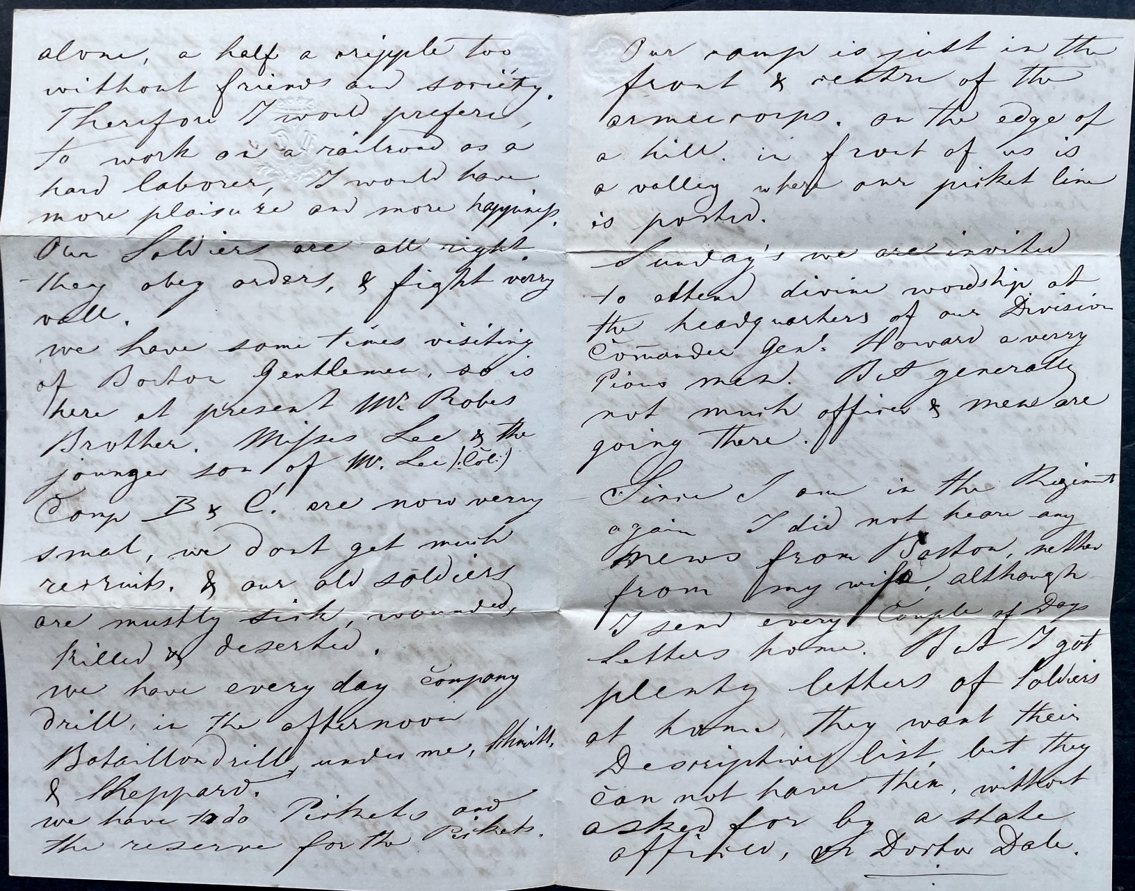 Since I am in the regiment again, I did not hear any news from Boston, neither from my wife, although I send every couple of days letters home. But I got plenty letters of soldiers at home. They want their Descriptive List but they cannot have them without asked for by a state officer or Doctor [William Johnson] Dale.