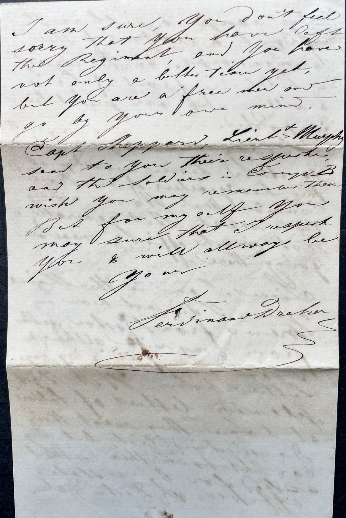 Capt. [Allen] Shephard & Lieut. Murphy send to you their respects and the soldiers in Co. B wish you may remember them. But for myself, you may be sure that I respect you and will always be your, — Ferdinand Dreher
