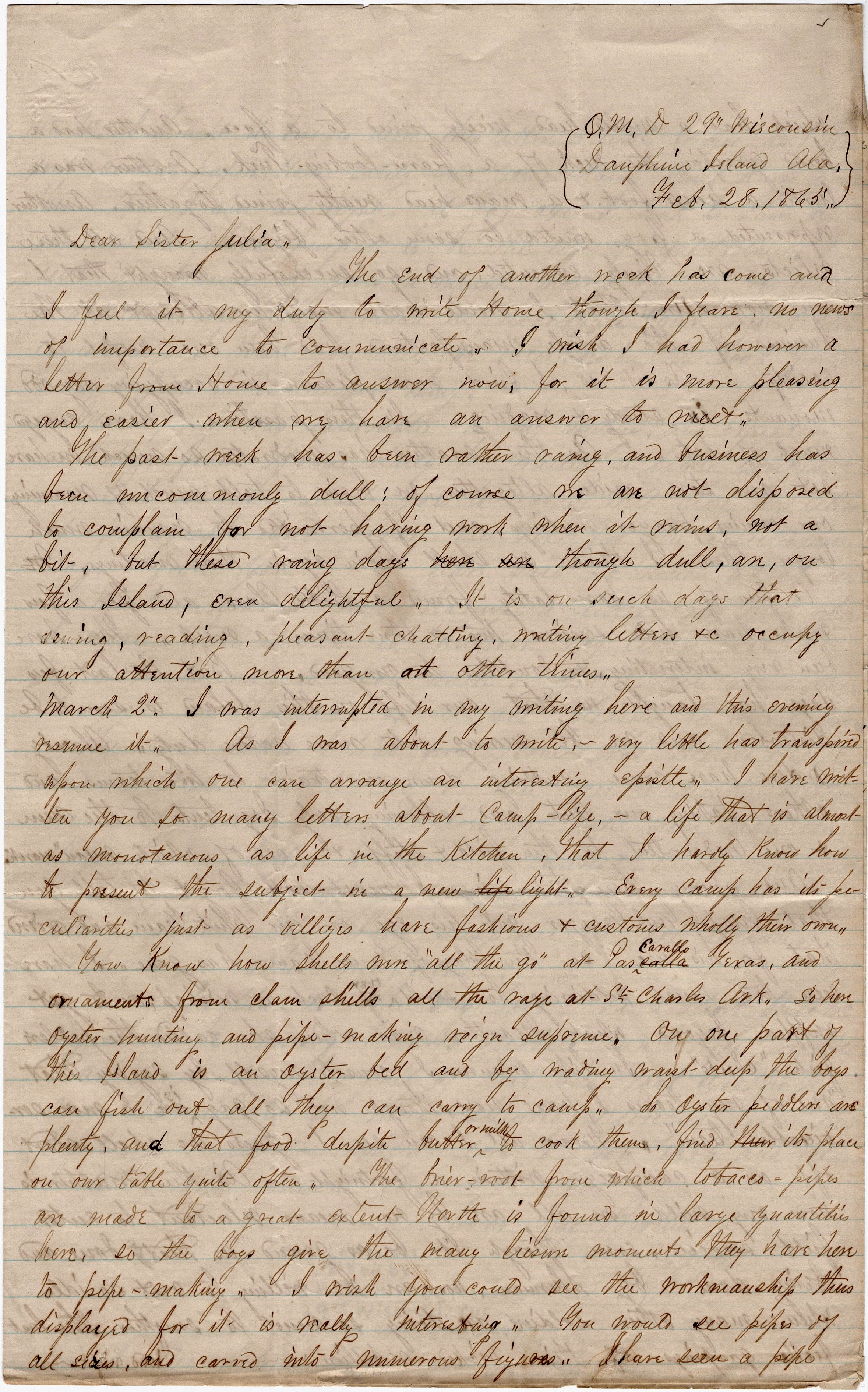You know how shells were “all the go” at Pas Carrallo, Texas, and ornaments from clam shells all the rage at St. Charles, Arkansas. So here oyster hunting and pipe making reign supreme. On one part of this island is an oyster bed and by wading waist deep the boys can fish out all they can carry to camp. So oyster peddlers are plenty and that food, despite butter or milk to cook them, find its place on our table quite often. The briar-root from which tobacco pipes are made to a great extent North is found in large quantities here so the boys give the many leisure moments they have here to pipe making. I wish you could see the workmanship thus displayed for it is really interesting. You would see pipes of all sizes and carved into numerous figures. I have seen a pipe which had a mule’s head nicely joined to a face. Another had a hand grasping the neck of a fierce looking Turk. Another was a turtle, a horse’s foot, and a man’s head neatly joined together. Another represented a frog united to some other figure. And all these relics are finely executed and so successfully wrought that I am not sure that I would have made an attempt at the business if the article manufactured had been one useful to society. As it is, I find more pleasure in occupying my odd moments in study and reading. In this pastime, I have engaged much of late.